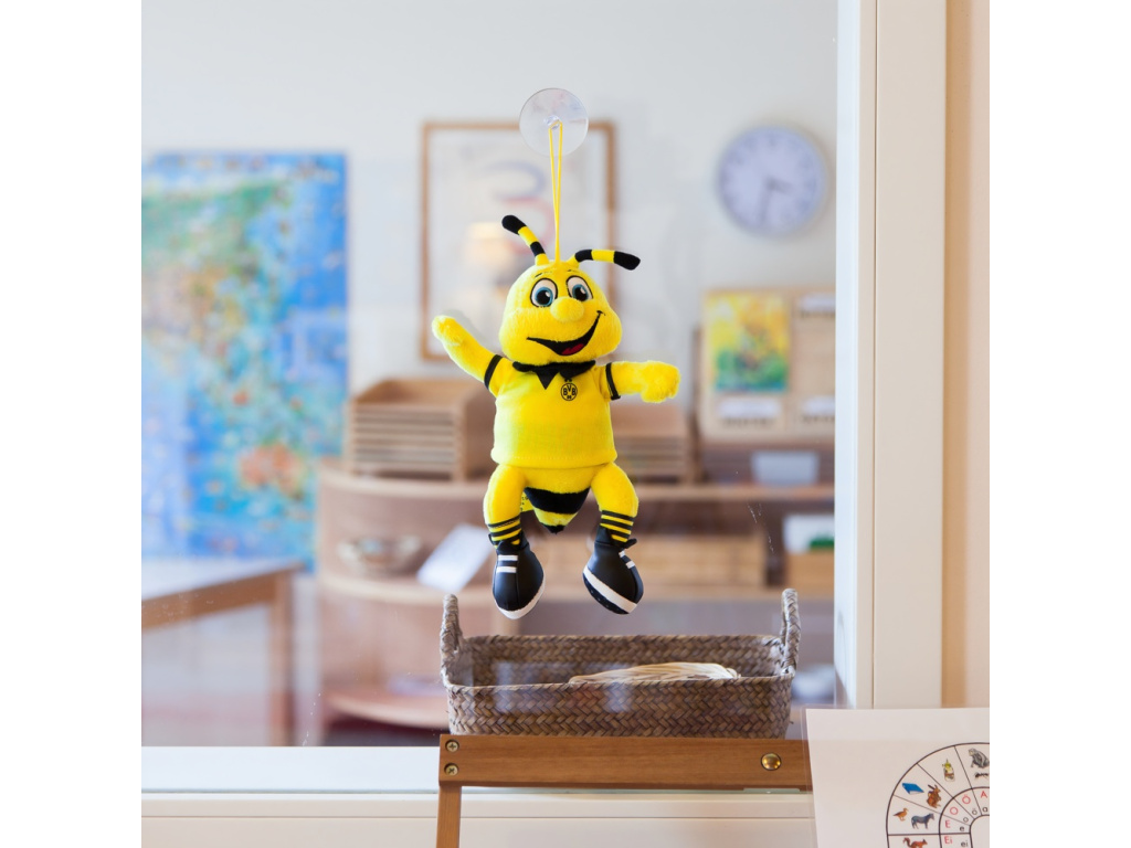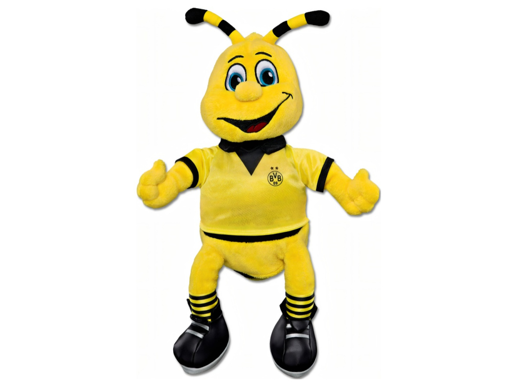 Plyšová včela Emma Borussia Dortmund v žluté a černé barvě. Oblečena do žlutého dresu klubu. Dres vyniká černým znakem slavného klubu na hrudi. Včela má na nohou obuté kopačky. Opatřena šňůrkou a přísavkou pro snadné zavěšení. Materiál polyester je příjemný a hebký. Výška 20 cm.