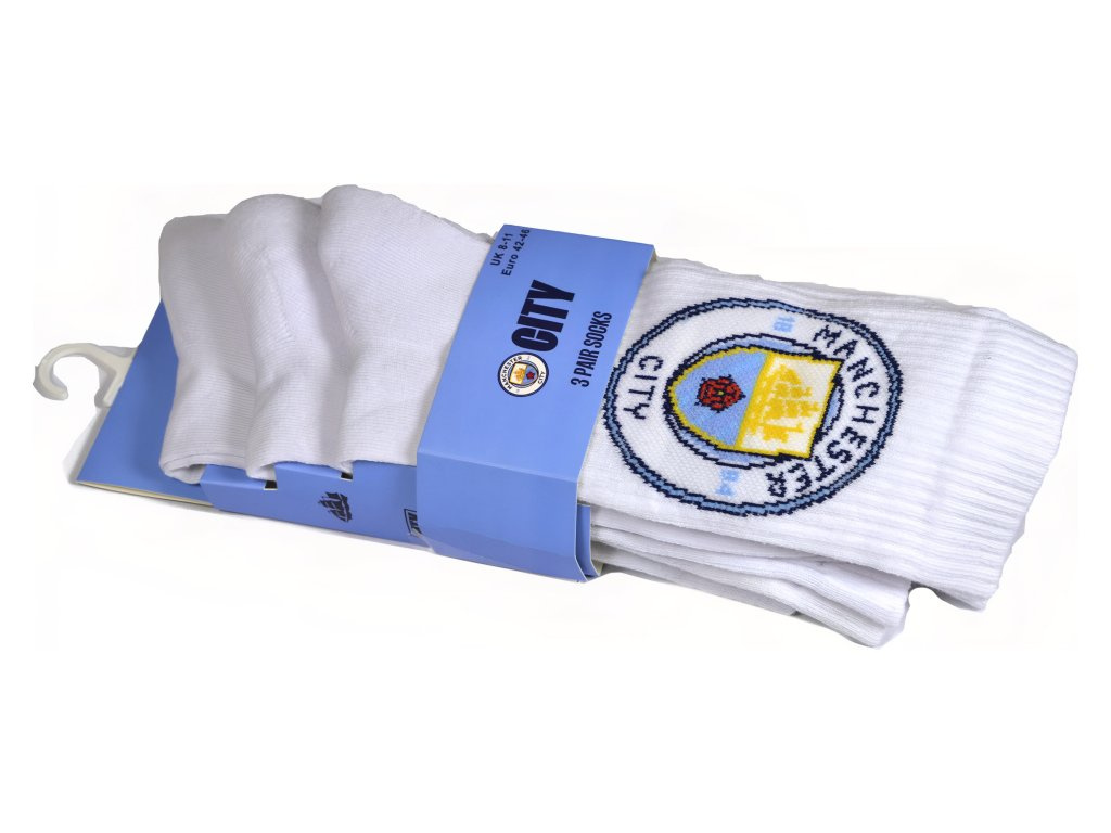 Bílé crew ponožky Manchester City v balení po 3 párech pro EU 42–46. Ideální na každý den i fandění. Příjemný bavlněný úplet s příměsí nylonu a elastanu je měkký a pružný. Žebrovaný lem drží na noze. Klubový znak je vetkaný do materiálu, takže se neodírá. Neutrální bílá se snadno kombinuje.