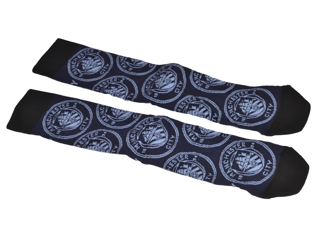 Fanouškovské ponožky Manchester City v crew výšce s celoplošným klubovým znakem. Tmavě modrý základ doplňuje světle modrý motiv. Špička a horní lem jsou černé. Bavlněný úplet s nylonem a elastanem je příjemný a pružný. Drží tvar i při celodenním nošení. Velikost EU 42–46.