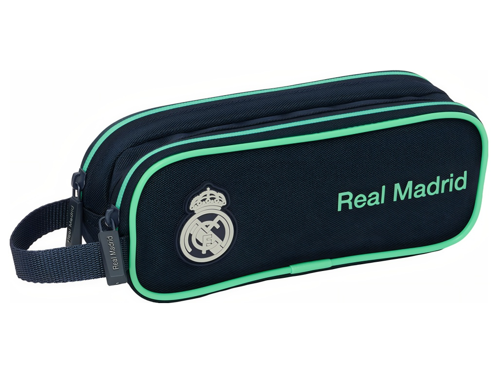 Dvoukomorové pouzdro Real Madrid v tmavě modré pro školáky i fanoušky. Mentolové lemování a nápis Real Madrid ladí s plastickým 3D klubovým znakem na čele. Dva oddělené prostory na zip udrží pastelky, fixy i drobnosti přehledně. Velké taháčky a boční poutko usnadní manipulaci. Uvnitř je volný prostor bez poutek, takže se vejdou i delší pravítka nebo nabíječka. Kompaktní rozměry pasují do školního batohu.