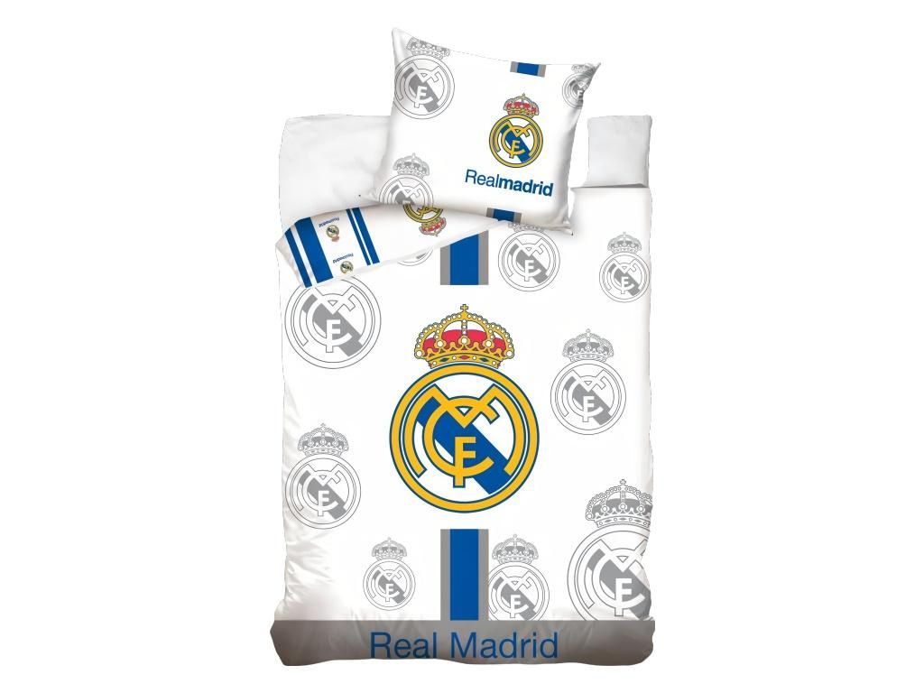 Oboustranné bavlněné povlečení Real Madrid pro každého fanouška Bílého baletu. Sada obsahuje povlak na peřinu (140 × 200 cm) a povlak na polštář (70 × 90 cm) z příjemné 100% bavlny. Přední strana zaujme velkým barevným znakem klubu uprostřed, doplněným svislými modrými a šedými pruhy a opakujícím se vzorem šedých znaků na bílém podkladu. Ve spodní části je nápis Real Madrid. Polštář má obdobný motiv se znakem a nápisem klubu. Hotelový uzávěr usnadňuje navlékání i sundávání bez zipů a knoflíků. Bavlna je prodyšná, příjemná na dotek a skvěle odvádí vlhkost, takže se pod ní dobře spí v létě i v zimě.