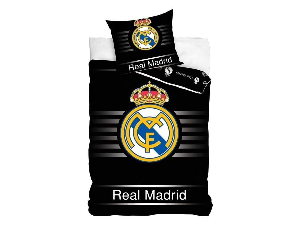 Oboustranné bavlněné povlečení Real Madrid s velkým znakem klubu na černém podkladu. Sada obsahuje povlak na peřinu (140 × 200 cm) a povlak na polštář (70 × 90 cm). Přední strana je černá s výrazným znakem klubu, korunkou a nápisem Real Madrid, rubová strana černá s menšími znaky klubu. Materiál 100% bavlna je příjemný na dotek, prodyšný a snadno se udržuje. Hotelový uzávěr drží peřinu i polštář na místě bez zipů a knoflíků.