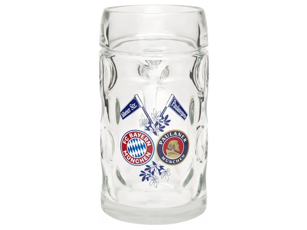 Půllitr FC Bayern Mnichov v průhledném provedení. Barevný znak. Ozdoben modrými detaily. Skleněné ucho. Objem 500 ml.
