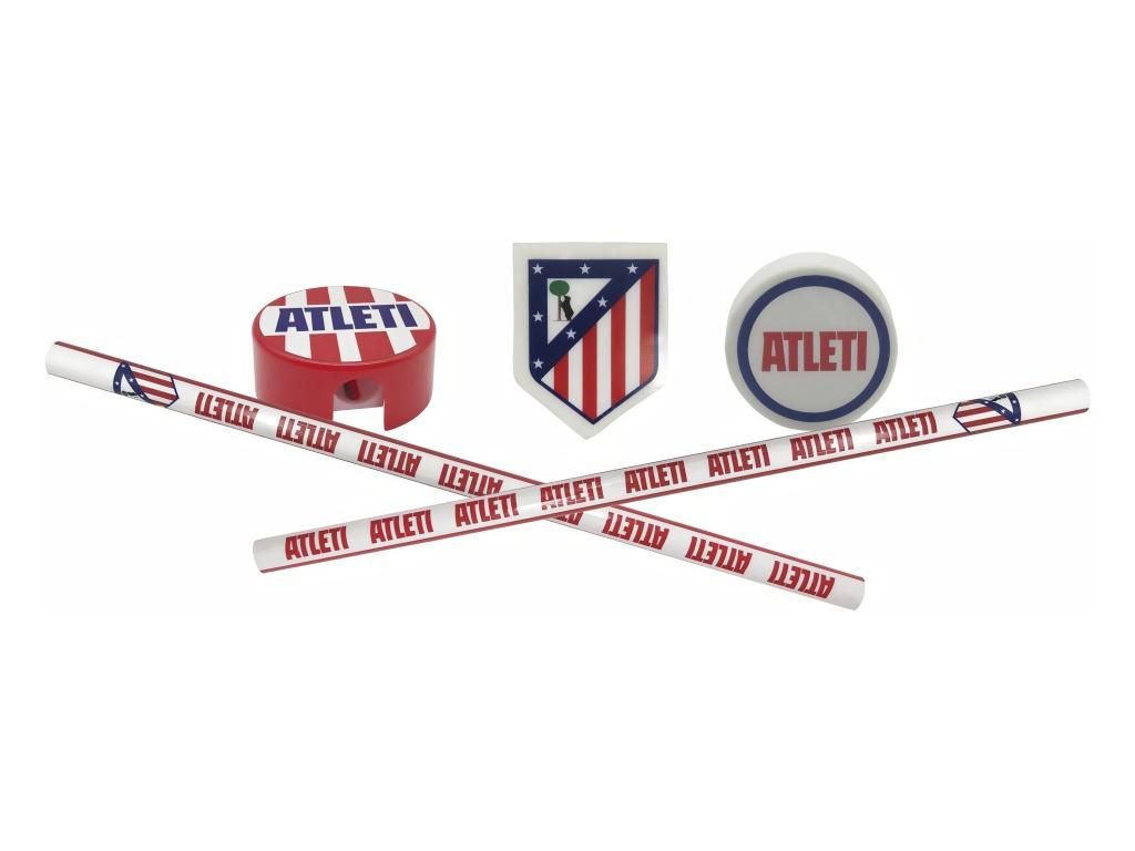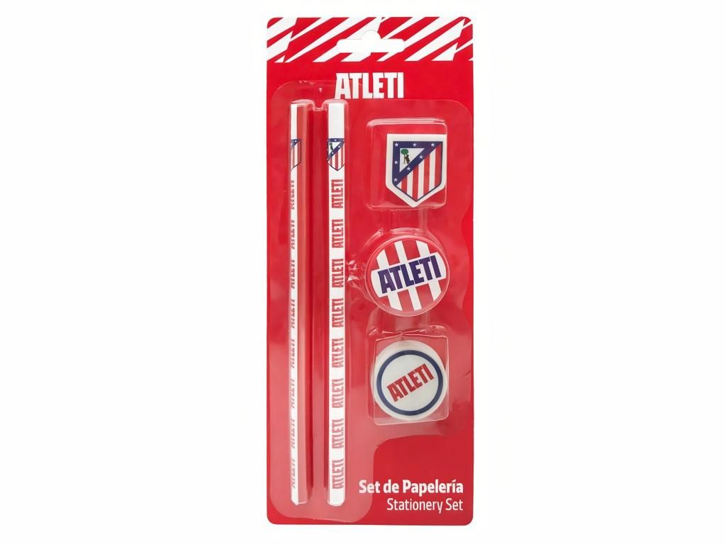 Sada psacích potřeb Atlético de Madrid s klubovými motivy ATLETI. Obsahuje dvě tužky, dvě gumy a ořezávátko — vše v červenobílém designu s nápisy ATLETI a znaky klubu. Tužky jsou bílé s opakujícím se červeným nápisem ATLETI a znakem klubu u horního okraje. Jedna guma má tvar klubového znaku, druhá je kulatá s nápisem ATLETI v tmavě modrém kruhu. Ořezávátko je červené, kulaté, s červenobílými pruhy a nápisem ATLETI na horní straně. Sada přijde v kartonovém blistru s průhledným okénkem, takže se hodí i jako dárek bez dalšího balení.
