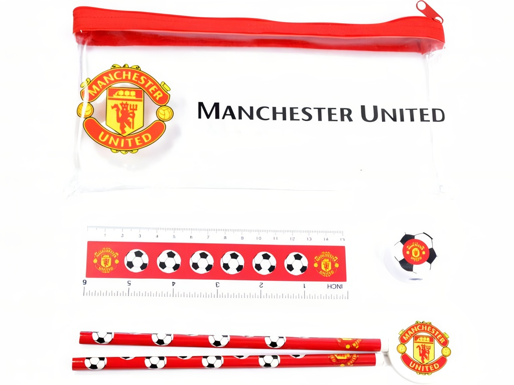 Sada psacích potřeb Manchester United v průhledném pouzdře na zip pro školáky i fanoušky. Uvnitř jsou 2 tužky, guma, ořezávátko a pravítko 15 cm. Vše je v klubových barvách se znakem a nápisem Manchester United. Průhledné pouzdro usnadní rychlou kontrolu obsahu. Zip drží vše pohromadě v batohu i na cestách. Pravítko má stupnici v centimetrech i palcích.