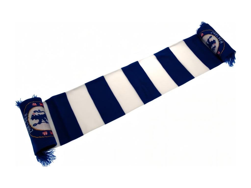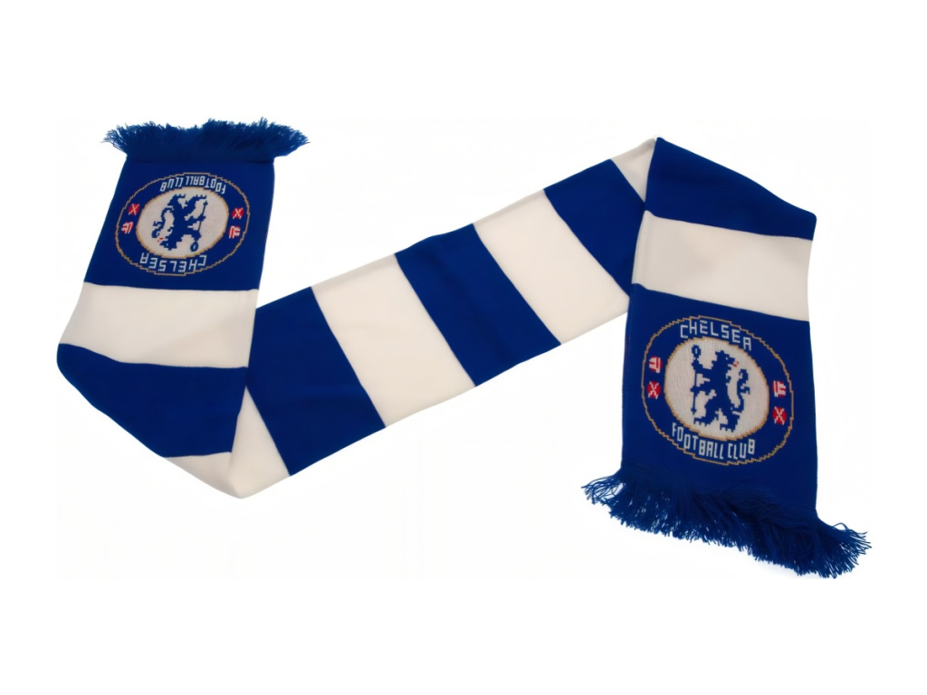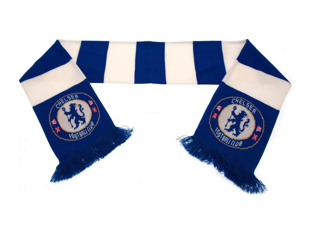 Šála Chelsea FC v kombinaci modré a bílé. Pruhovaná. Barevný znak na lemování. Zakončení barevnými třásněmi. Příjemný akryl. Rozměr 132 x 19 cm.