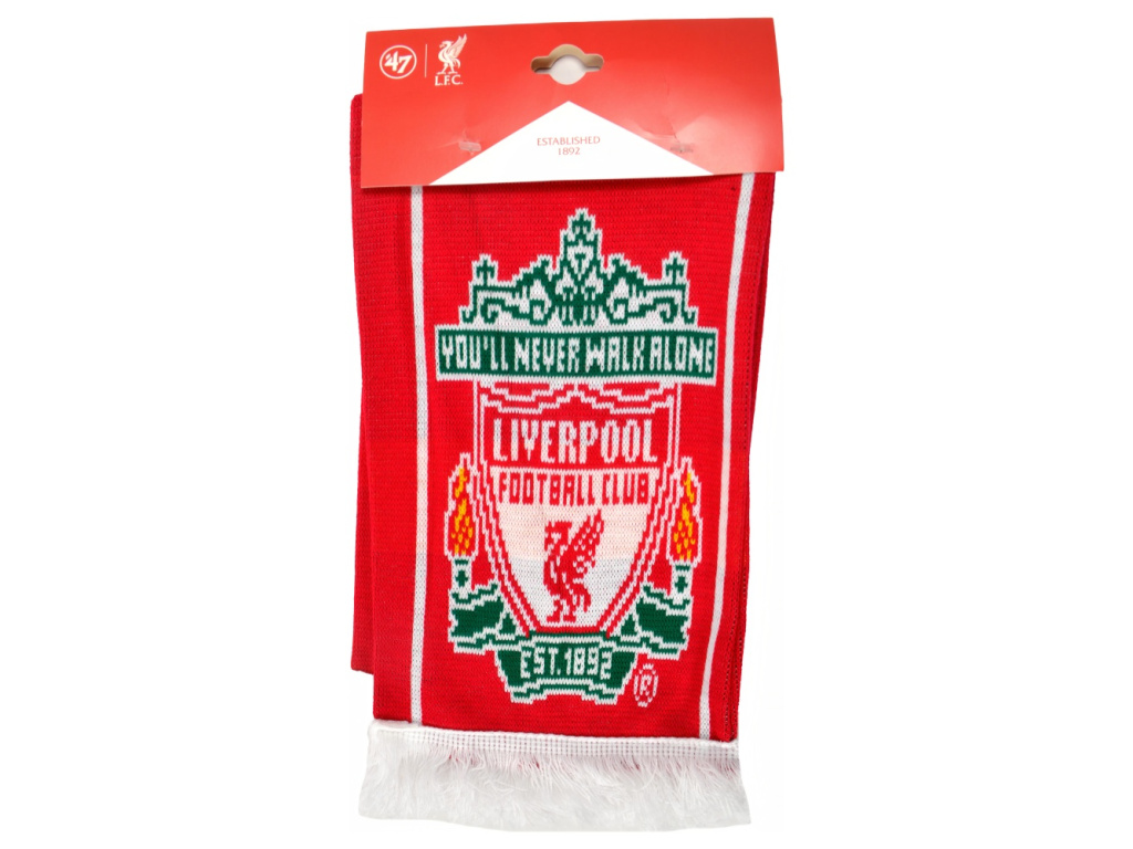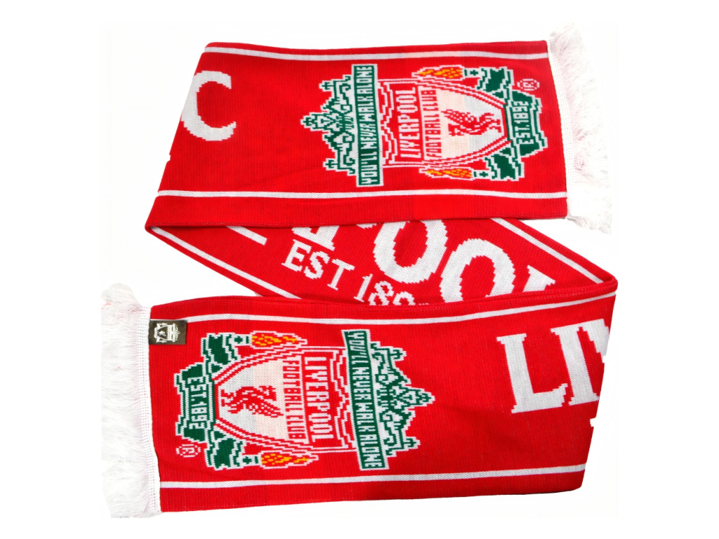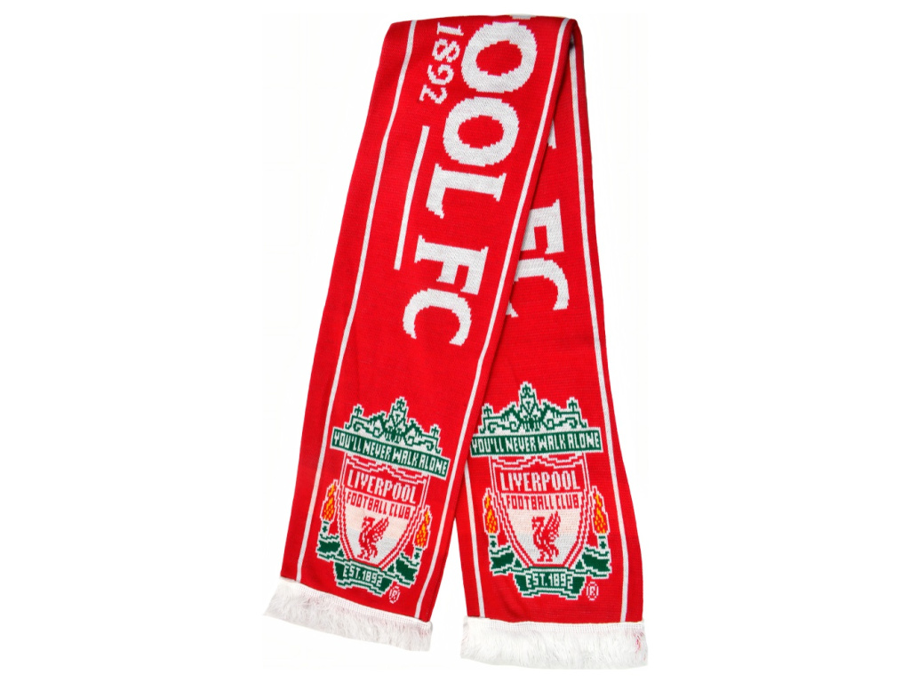 Šála Liverpool FC v kombinaci červené a bílé barvy. Uprostřed nápis Liverpool FC v kontrastní barvě. Na obou koncích je znak klubu. Zakončena třásněmi. Příjemný materiál.
