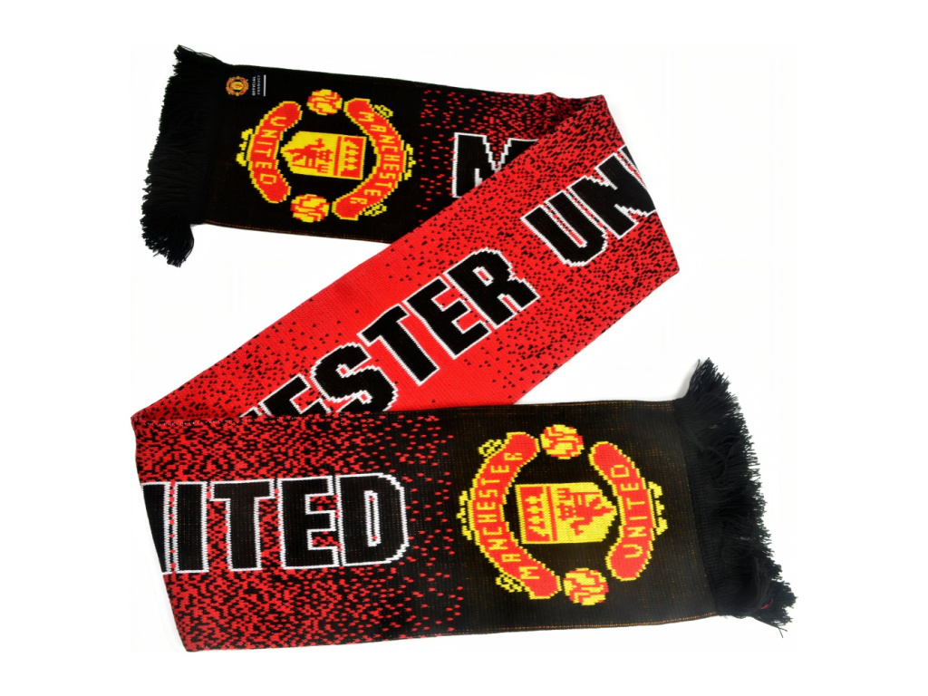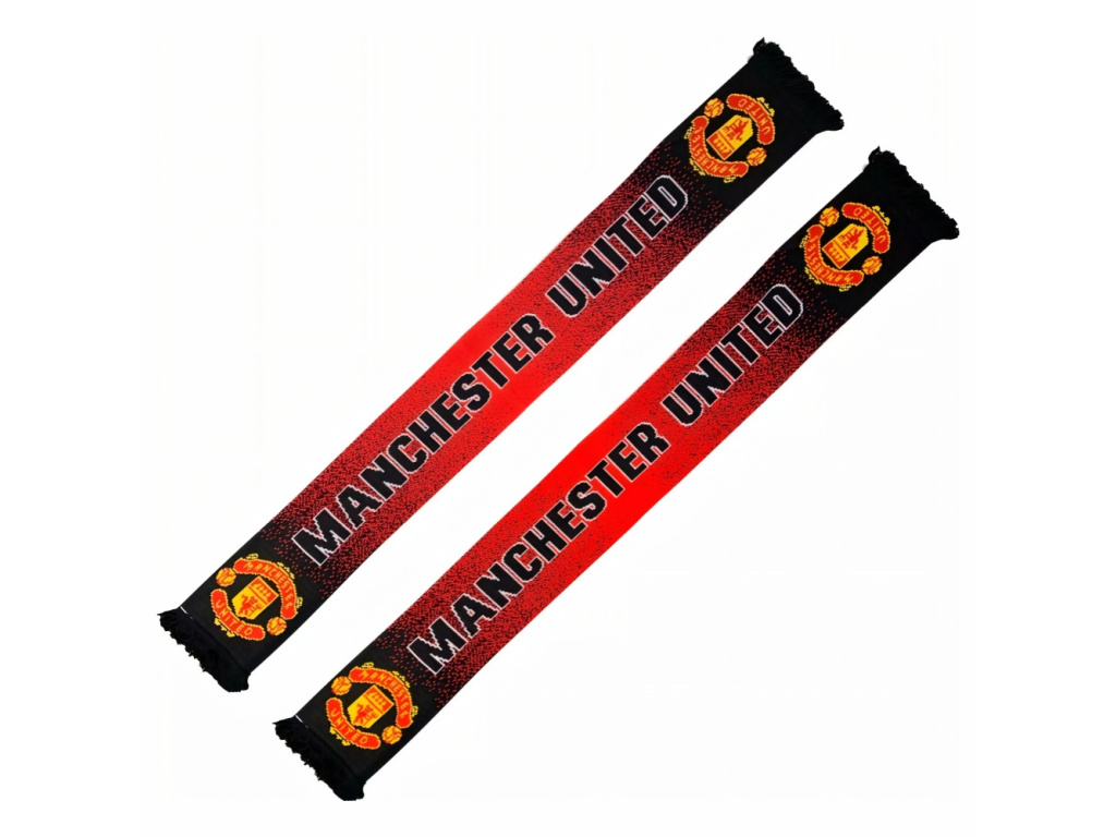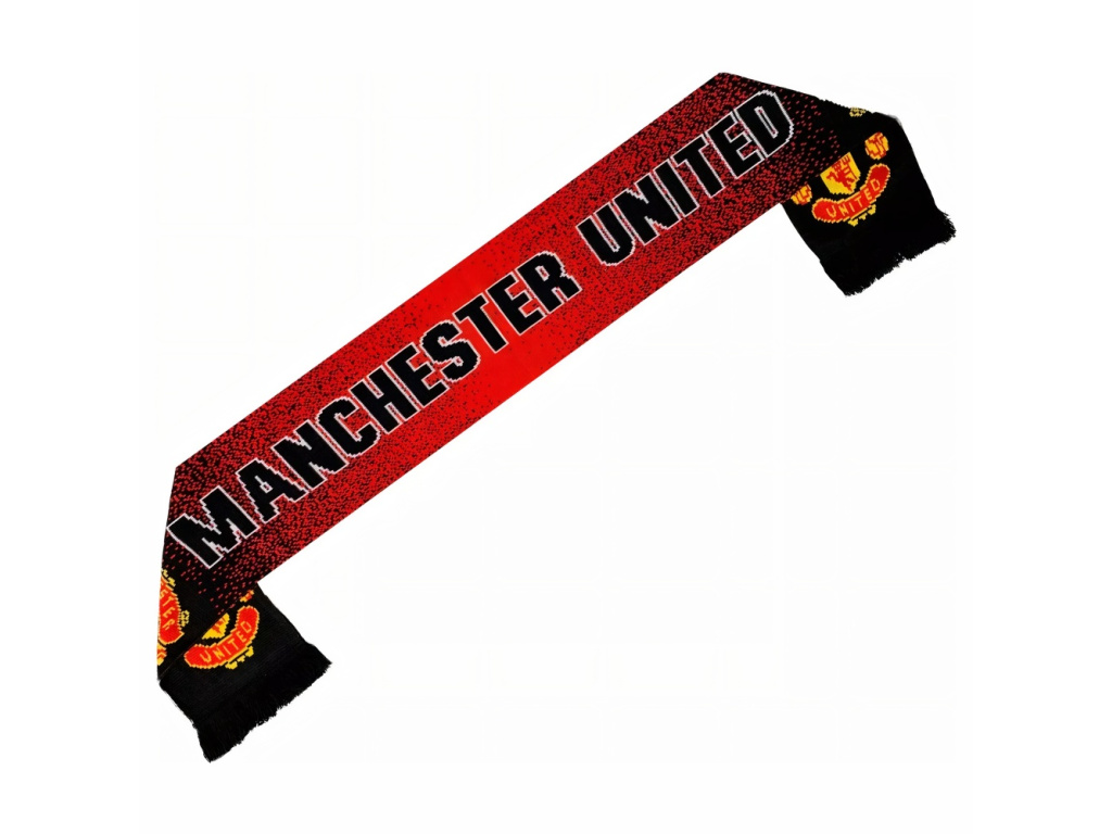 Šála Manchester United FC v kombinaci červené a černé barvy. Uprostřed nápis Manchester United v kontrastní barvě. Na obou koncích znak klubu. Zakončena třásněmi. Příjemný pletený materiál.