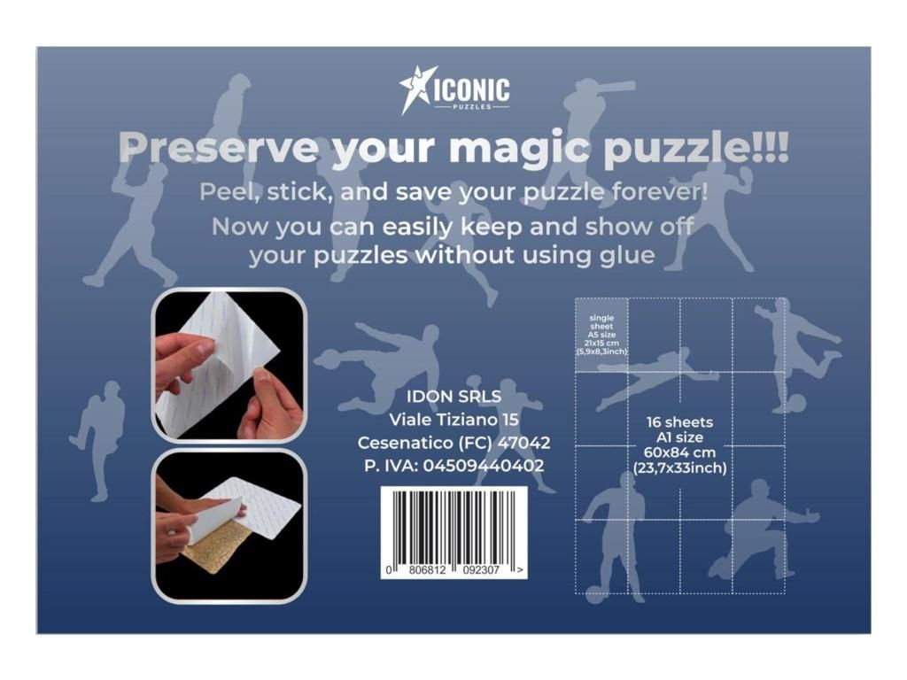 Sada 16 samolepicích archů formátu A5 pro snadné uchycení složeného dřevěného puzzle. Žádné lepidlo, žádný nepořádek — permanentní samolepicí vrstva udrží dílky spolehlivě pohromadě. Celková pokrytá plocha odpovídá formátu A1 (60 × 84 cm), takže jednou sadou zafixuješ až 3 malá dřevěná puzzle (150 dílků), 2 střední (270 dílků) nebo 1 velké (500 dílků) z řady Iconic Puzzles. Postup je jednoduchý: puzzle slož na stole, opatrně otoč, přilep archy na zadní stranu a přebytečné okraje ořízni.