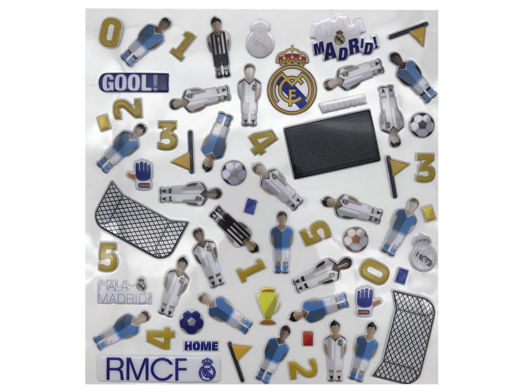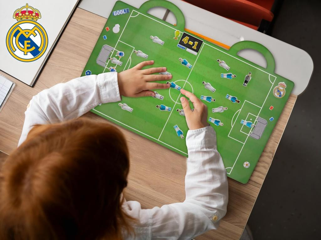 Samolepková kniha Real Madrid s rozkládacím fotbalovým hřištěm a sadou odnímatelných 3D samolepek. Kniha se po rozložení promění v kompletní hrací plochu se všemi čarami a brankovišti. Na ni si poskládáš vlastní zápas z desítek znovupoužitelných samolepek — hráče, branky, míče, rozhodčího i výsledkovou tabuli. Samolepky jdou přilepit a odlepit znovu a znovu, takže každá hra vypadá jinak. Dvě madla z kartonu umožňují knížku pohodlně přenášet.