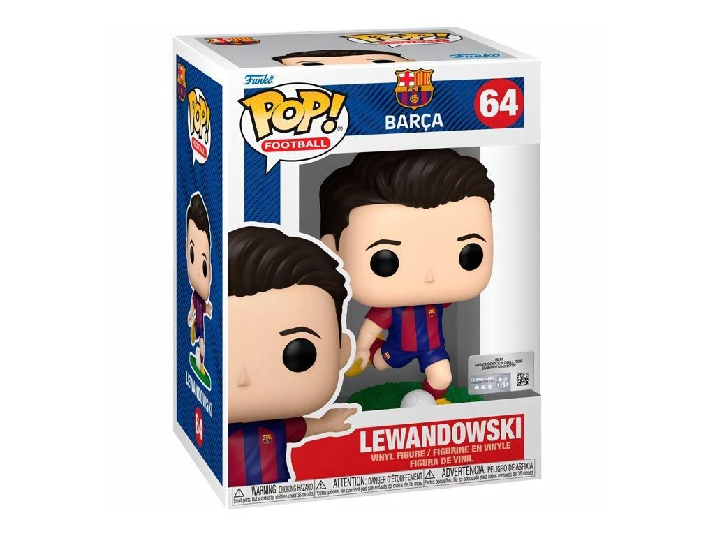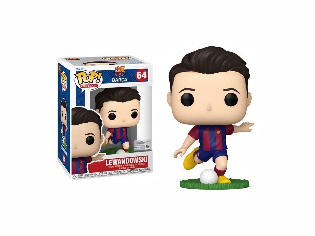 Sběratelská vinylová figurka Funko POP! 64 Football — Robert Lewandowski v domácím dresu FC Barcelona. Figurka zachycuje polského kanonýra v dynamické póze při střele, s bílým míčem u nohou. Lewandowski má na sobě ikonický modrovínový pruhovaný dres se znakem klubu na hrudi, tmavě modré šortky, vínové štulpny a žluté kopačky. Stojí na zeleném travnatém podstavci, který celé scéně dodává autentický fotbalový nádech. Figurka je vyrobená z vinylu v klasické velikosti 4" (cca 10 cm) a dodáváme ji v originální krabičce s průhledným okénkem — můžeš ji vystavit přímo v balení nebo mimo něj.