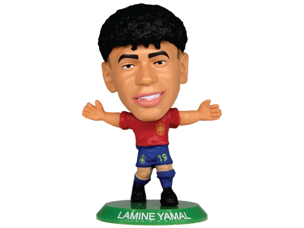 Sběratelská figurka SoccerStarz Lamine Yamal v dresu Španělska pro fanoušky a sběratele od 4 let. Měří 5 cm a stojí na zeleném podstavci se jménem. Červený domácí dres s národním znakem na hrudi a číslem 19 na šortkách vynikne v poličce, vitríně i na pracovním stole.