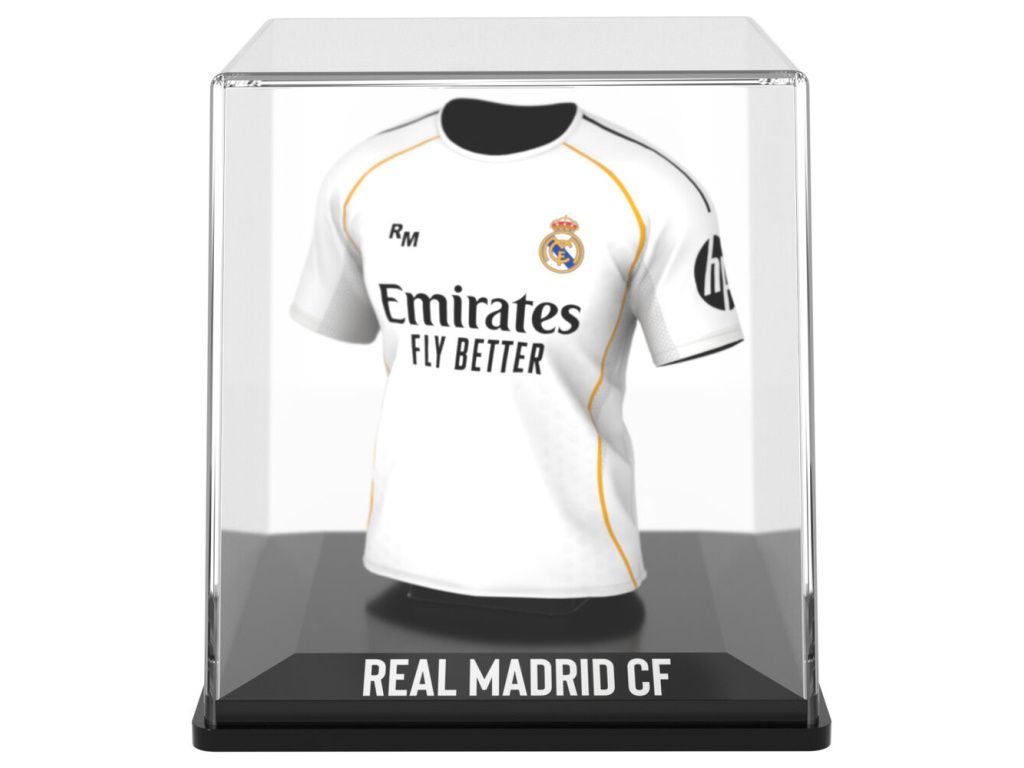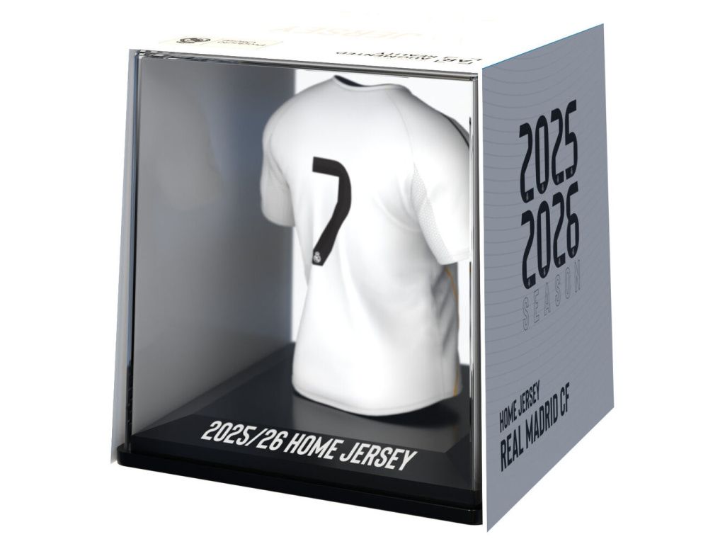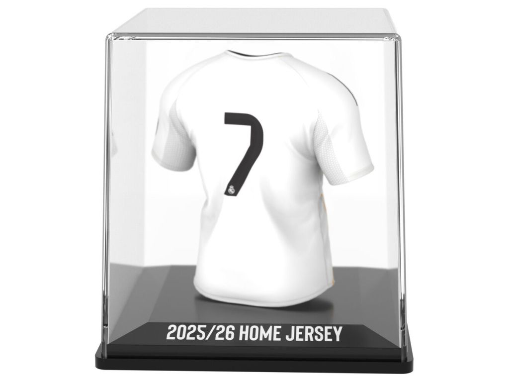 Sběratelský mini dres Real Madrid v domácím provedení sezony 2025/26 s průhlednou vitrínou. Detailní replika ikonického bílého dresu se zlatými lemovacími liniemi, černým límcem a číslem 7 na zádech. Vitrína z akrylátu s černým podstavcem chrání dres a zároveň ho efektně vystavuje. Mini dres je vyroben z vinylu a biodegradabilního plastu, takže spojuje kvalitní zpracování s ohledem na životní prostředí. Součástí je NFC čip pro ověření pravosti a přístup k rozšířené realitě — stačí přiložit telefon.