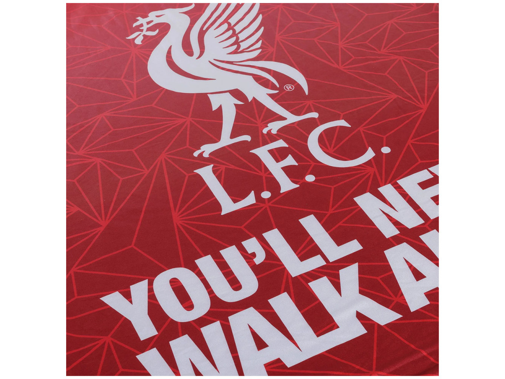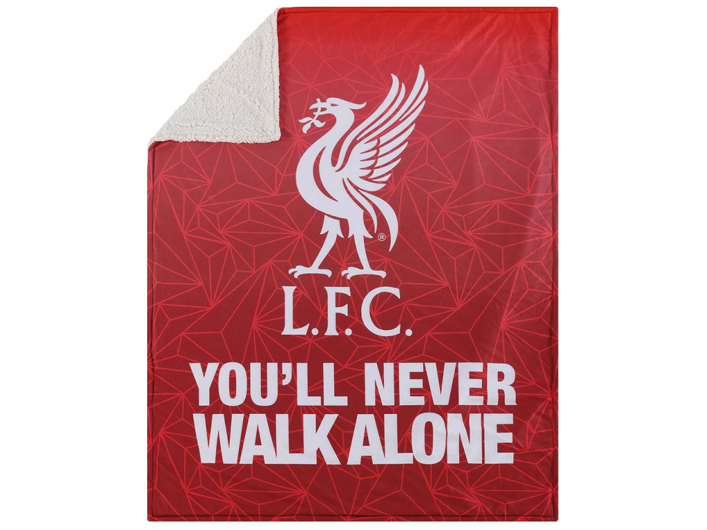 Hřejivá sherpa deka Liverpool FC 125 × 150 cm pro fanoušky Reds. Červený líc zdobí bílý znak L.F.C. a slogan „You'll Never Walk Alone“ na geometrickém podkladu. Rub je z měkkého bílého sherpa fleecu, který příjemně zahřeje. Líc je hladký, rub huňatý pro extra komfort. Lehká a rychle schne. Materiál 100 % polyester.