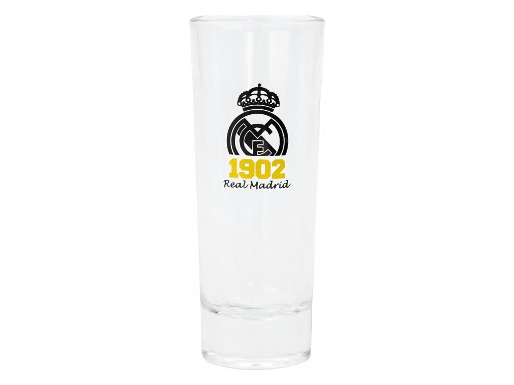 Sklenice na panáky Real Madrid s klubovým znakem a letopočtem založení 1902. Vysoký úzký tvar z čirého skla padne dobře do ruky a na baru vypadá skvěle. Na přední straně je černý znak klubu doplněný žlutým letopočtem 1902 a nápisem Real Madrid. Panák se dodává v papírové krabičce s okénkem, takže se hodí i jako dárek bez dalšího balení.