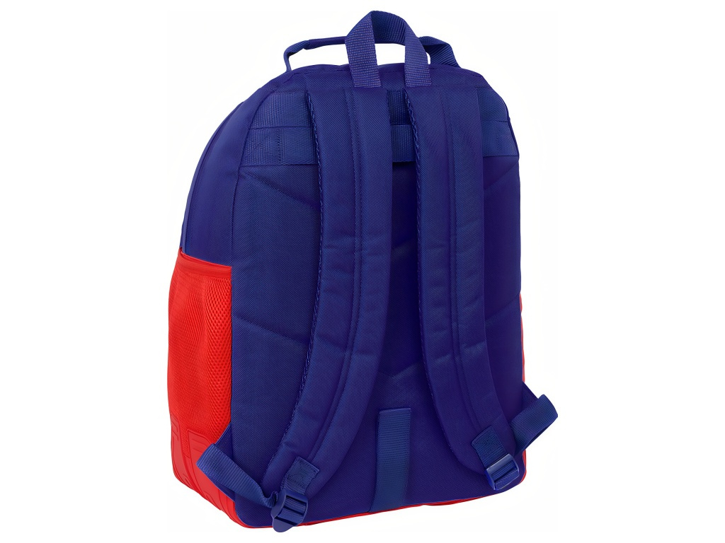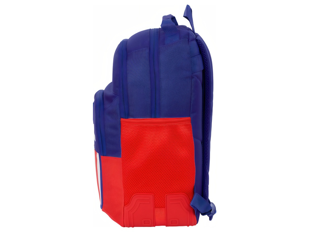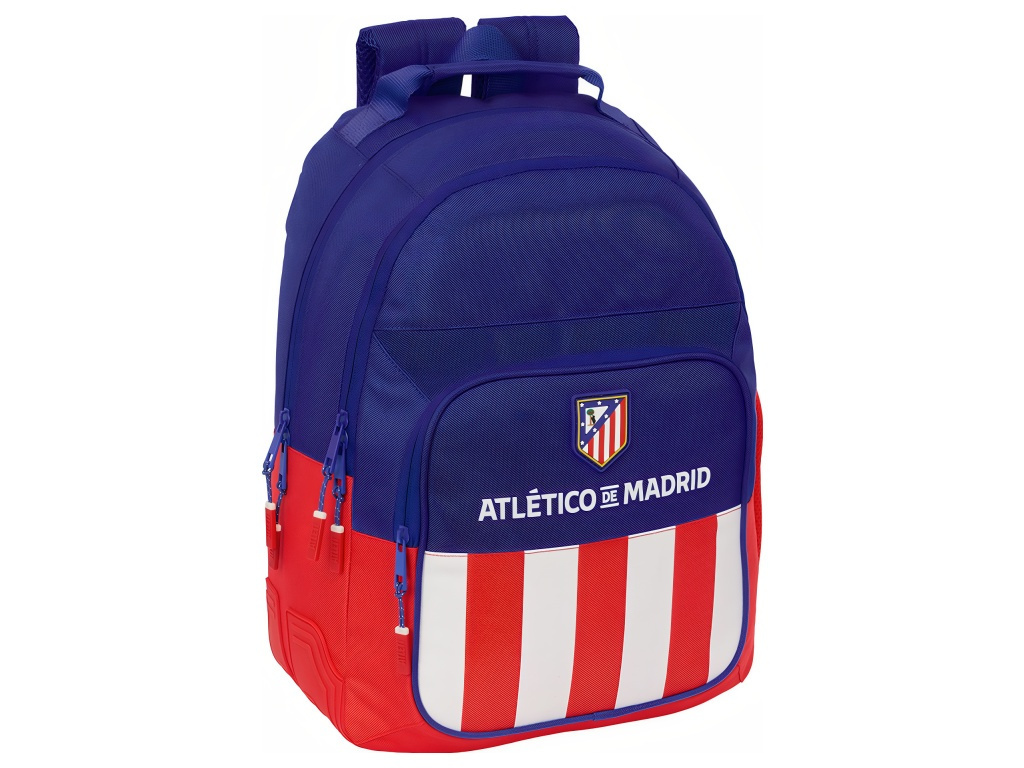 Školní batoh Atlético Madrid v modré, červené a bílé se znakem klubu na přední straně. Přední stranu zdobí znak Atlético Madrid. Batoh má 2 hlavní komory na zip a přední kapsu na zip. Na boku je kapsa na láhev. Přední kapsa obsahuje vnitřní organizér. Hlavní komory mají zapínání na dvojitý zip. Dvojité jezdce usnadňují otevírání. Rozměr batohu je 32 × 15 × 42 cm. Objem je 20 l. Ramenní popruhy jsou ergonomicky tvarované a polstrované. Zádová část je polstrovaná. Nahoře je madlo s měkkým potahem. Spodní rohy chrání gumové kryty proti oděru. Batoh lze připevnit k vozíku na batohy. Hodí se do školy i na kroužky.