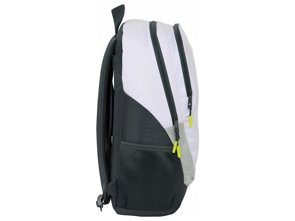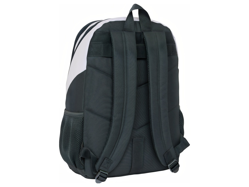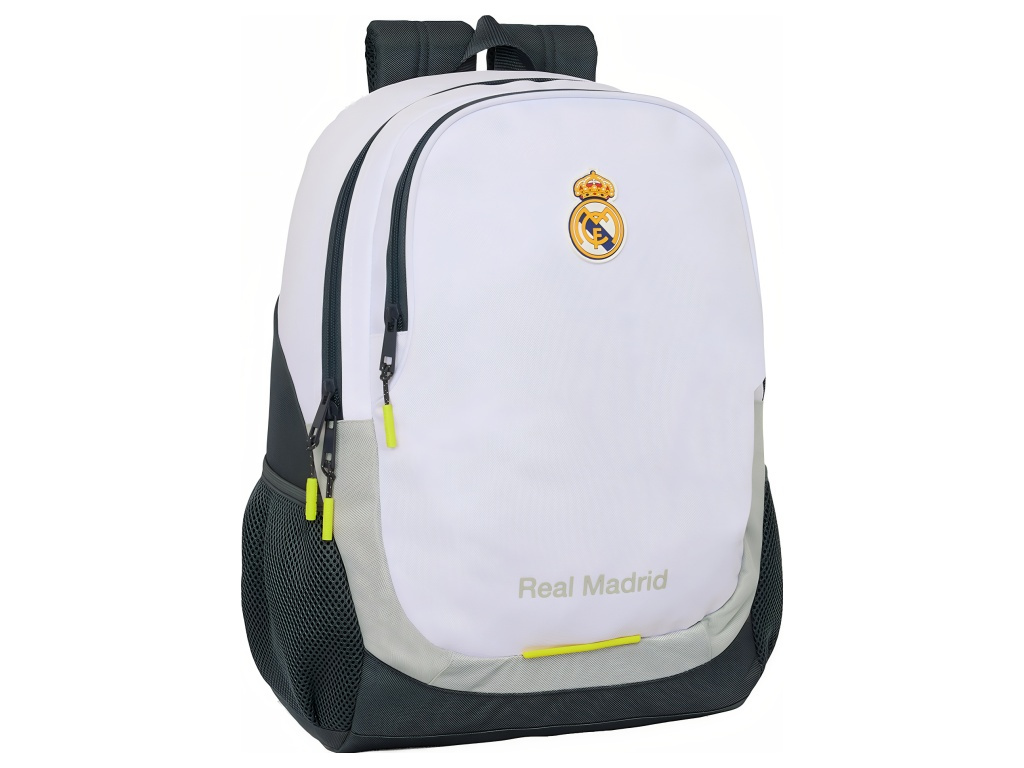 Školní batoh Real Madrid FC v bílé se šedými detaily a kontrastními prvky. Záda a ramenní popruhy jsou černé. Přední stranu zdobí znak Real Madrid FC. Batoh má 2 hlavní komory na zip. Na bocích jsou kapsy na láhev. Hlavní zipy mají dvojité jezdce pro snadné otevírání. Horní madlo usnadní přenášení v ruce. Rozměry batohu jsou 32 × 16 × 44 cm. Objem je 23 l. Ramenní popruhy jsou ergonomicky tvarované a polstrované. Zádová část je polstrovaná. Batoh lze připevnit k vozíku na kolečkách. Kontrastní zelené detaily dodají výrazný vzhled. Hodí se do školy i na kroužky.