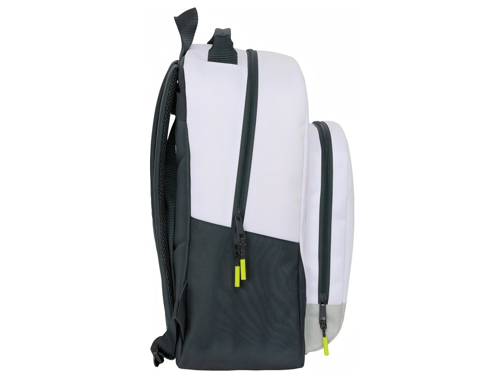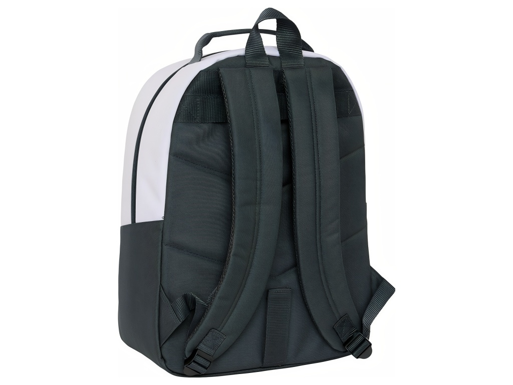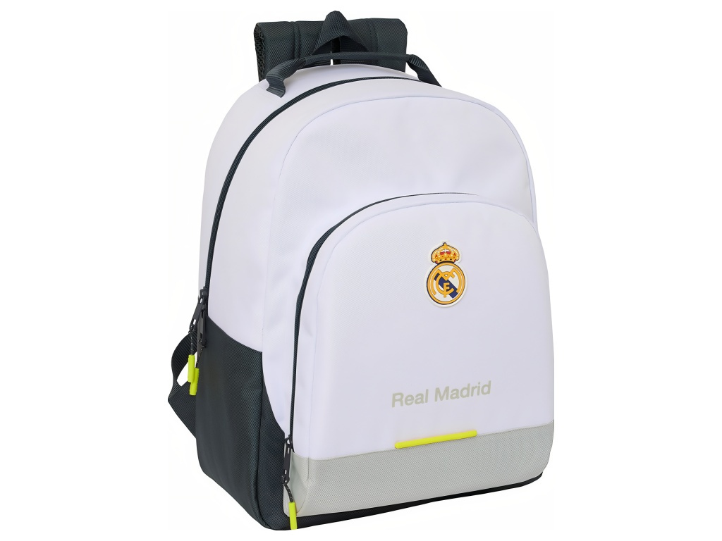 Školní batoh Real Madrid FC v bílé a šedé se zelenými kontrastními prvky a znakem na přední kapse. Záda a ramenní popruhy jsou v černé barvě. Přední stranu zdobí barevný znak Real Madrid FC a nápis Real Madrid. Batoh má 1 hlavní komoru na zip. Na přední straně je velká kapsa pro sešity a drobnosti. Hlavní zip má dvojitý jezdec pro snadné otevírání. Rozměr 32 × 15 × 42 cm. Objem je 20,1 l. Ramenní popruhy a záda batohu jsou polstrované. Horní madlo má měkký potah. Batoh lze připevnit k vozíku na batohy. Hodí se do školy i na volný čas.