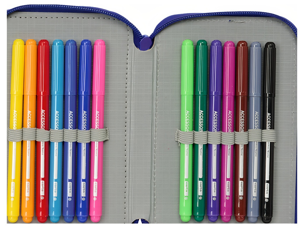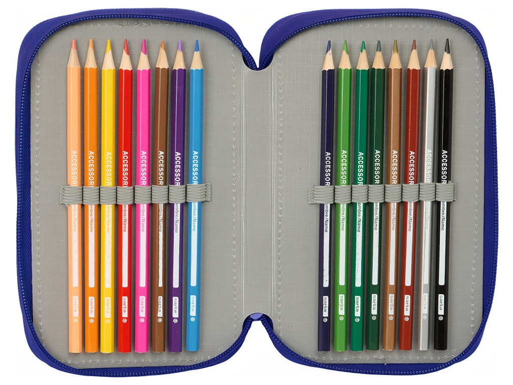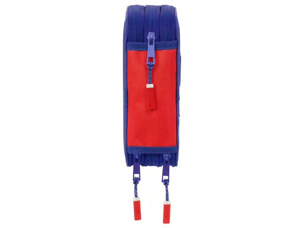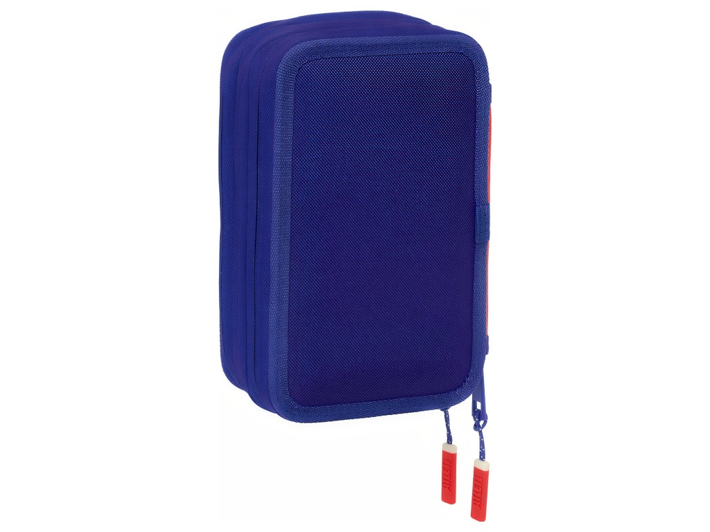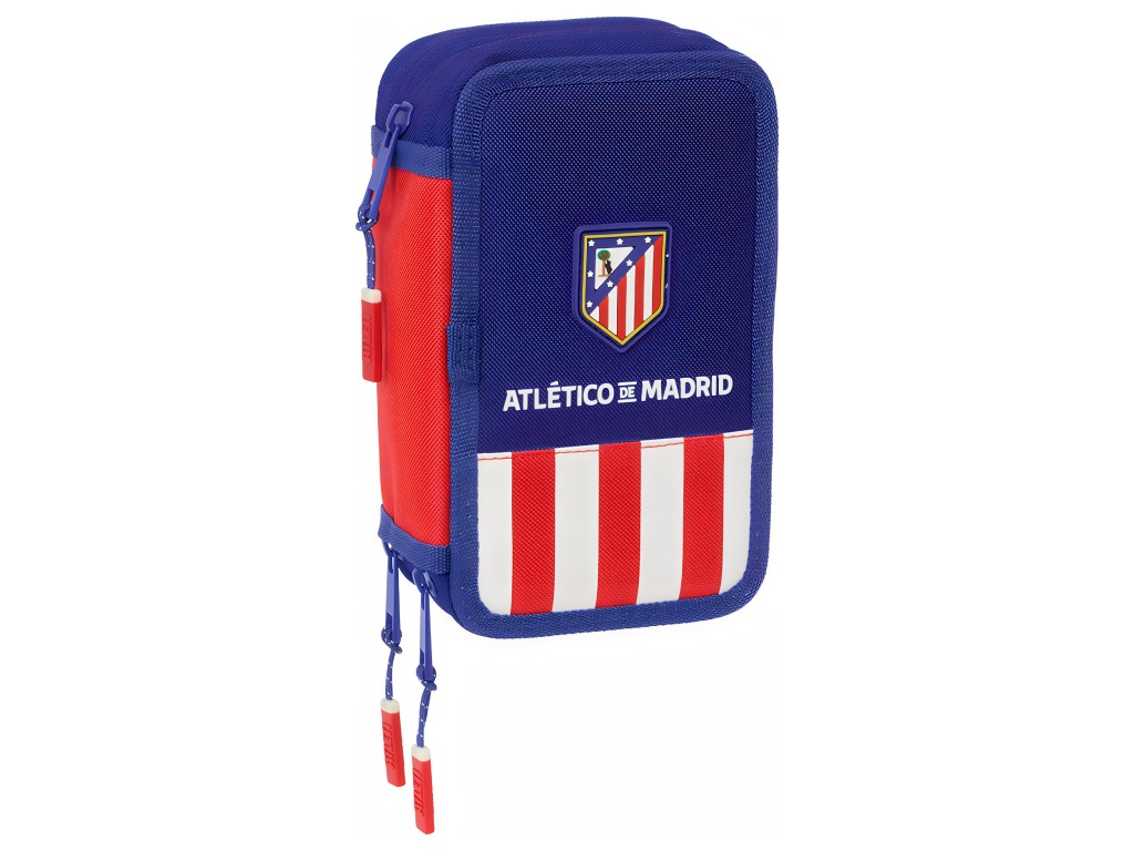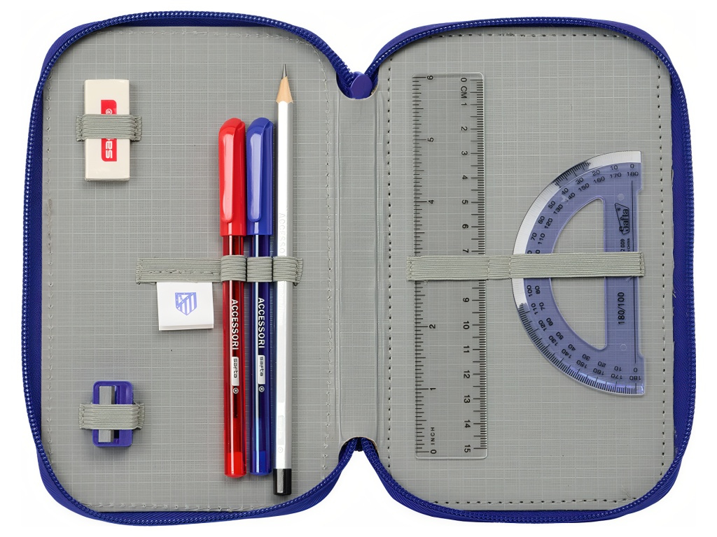 Školní penál Atlético Madrid, červeno-modrý, 3 patra, vybavený 37 díly se znakem na přední straně. Přední stranu zdobí znak klubu. Pouzdro obsahuje 3 patra. Zapínání je na zip. Uvnitř je organizér s poutky pro přehledné uložení pomůcek. V prvním patře je guma, tužka, modro-červené pero, ořezávátko, modré pravítko a úhloměr. Druhé patro obsahuje 16 pastelek. Třetí patro obsahuje 14 fixů. Přehledné členění usnadní hledání pomůcek. Rozměry jsou 95 x 125 x 55 mm. Objem je 1,3 l. Hodí se do školy i na kroužky.