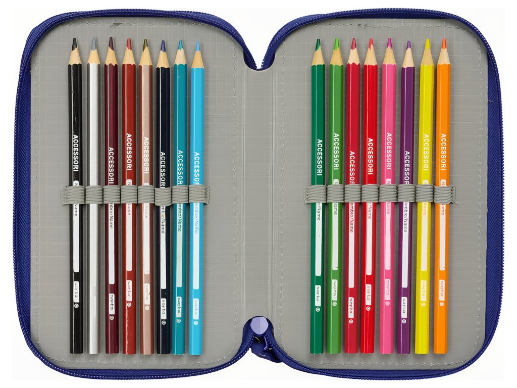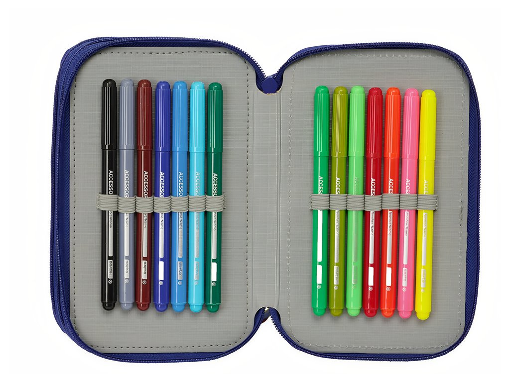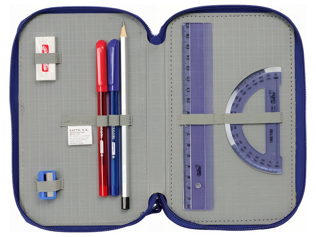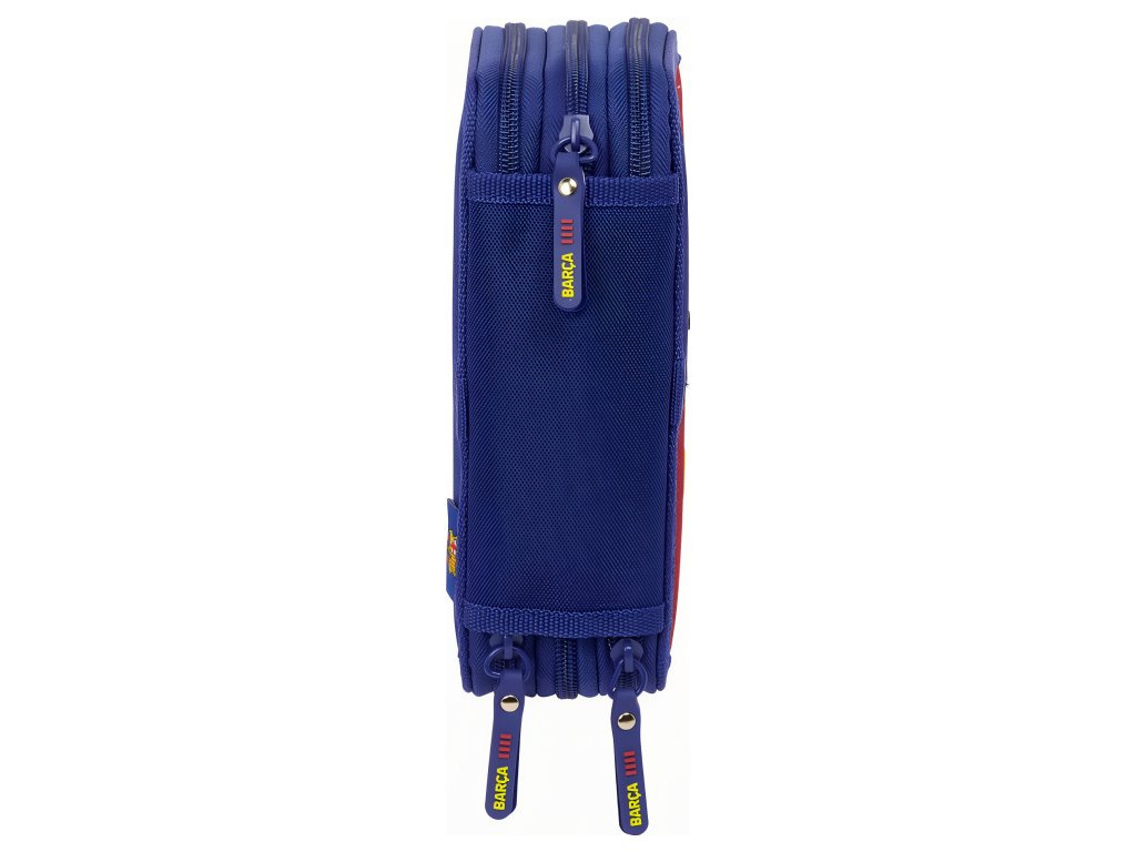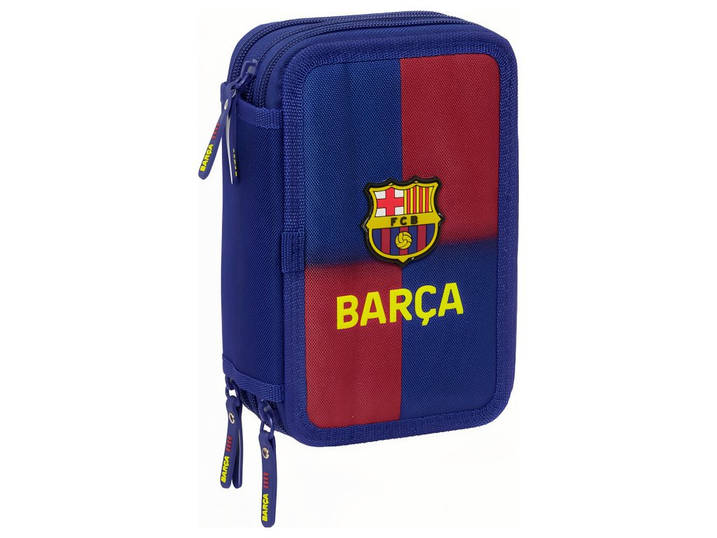 Školní penál FC Barcelona, modro‑červený, 3 patra, vybavený 37 ks pomůcek. Design vychází z kolekce 25/26. Barevné provedení je v modro‑červené klubové kombinaci. Přední stranu zdobí znak klubu. Každá část má vlastní prostor pro pomůcky. Otevírání zajišťuje zapínání na zip. Uvnitř je organizér s pevnými poutky. První oddíl obsahuje vybavení jsou guma, grafitová tužka, modro‑červené propisky, ořezávátko, pravítko a úhloměr. Druhý oddíl obsahuje 16 barevných tužek. Třetí oddíl obsahuje 14 fixů. Členění do tří komor udrží pořádek. Rozměry jsou 125 × 55 × 195 mm. Vyrobeno z odolného polyesteru. Povrch lze otírat vlhkým hadříkem. Hodí se do školy i na kroužky.