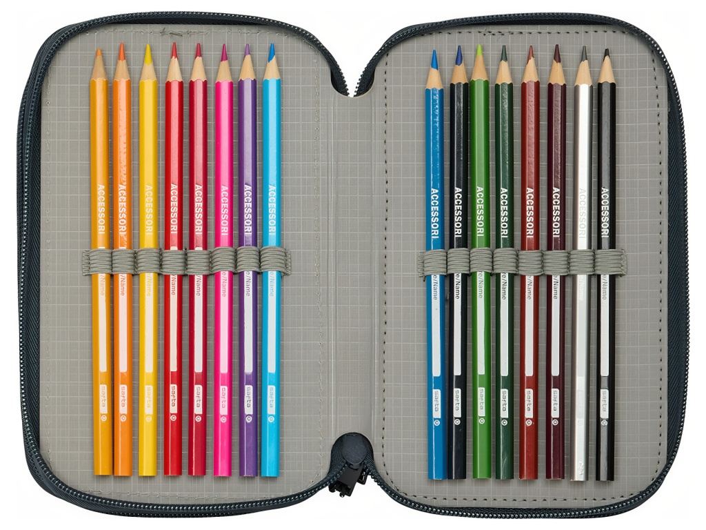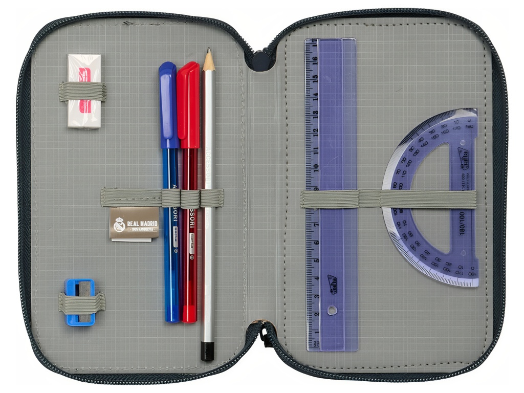 Školní penál Real Madrid FC v elegantní bílé barvě se znakem klubu má 3 patra a je plně vybavený. Penál zdobí klubové barvy a sportovní motiv. Na přední straně je barevný znak Real Madrid. Má 3 patra a zapínání na zipy. Uvnitř jsou elastická poutka a přehledné oddíly. První patro ukrývá gumu, tužku, dvoubarevné kuličkové pero, ořezávátko, pravítko a úhloměr. Druhé patro obsahuje 16 pastelek. Třetí patro nabízí 14 fixů. Celkem má 37 dílů. Díky členění máš vše po ruce a nic se nemíchá. Rozměr 12,5 × 19,5 × 5,5 cm. Materiál tvoří polyester, který je odolný a snadno se čistí. Údržba je jednoduchá, stačí otřít vlhkým hadříkem. Hodí se pro školáky a fanoušky do školy i na kroužky.