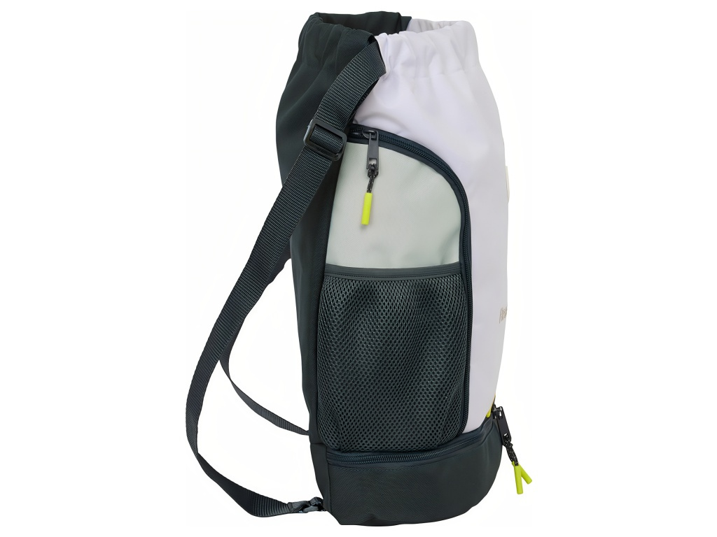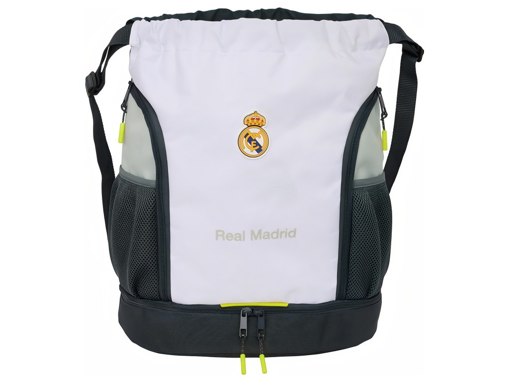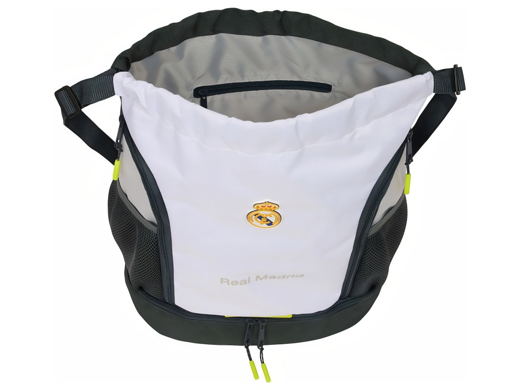 Sportovní batoh Real Madrid FC v kombinaci bílé, šedé a černé barvy. Kontrastní žluté jezdce zipů dodávají výrazný detail. Přední část zdobí znak Real Madrid FC. V dolní části je decentní nápis Real Madrid. Hlavní komora má horní uzavírání na stahovací šňůrku. Ve spodní části je spodní přihrádka na zip. Přihrádka má obousměrné otevírání pro snadný přístup. Uvnitř je kapsa na zip pro drobnosti. Na bocích je zip pro boční přístup. Nechybí boční síťová kapsa na láhev nebo míček. Zadní strana je černá pro menší viditelnost ušpinění. Rozměr batohu je 34 × 15 × 43 cm. Objem je 21,93 l. Nastavitelné ramenní popruhy jsou z popruhové tkaniny. Batoh je vhodný pro tréninky. Hodí se i na cestování a volný čas.