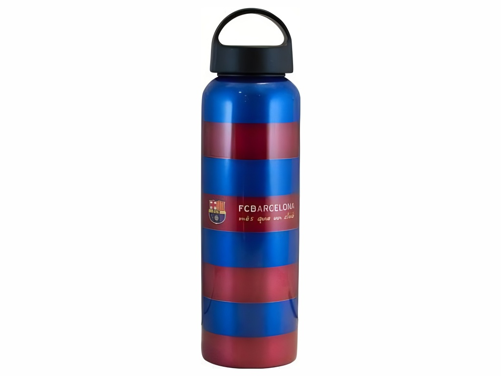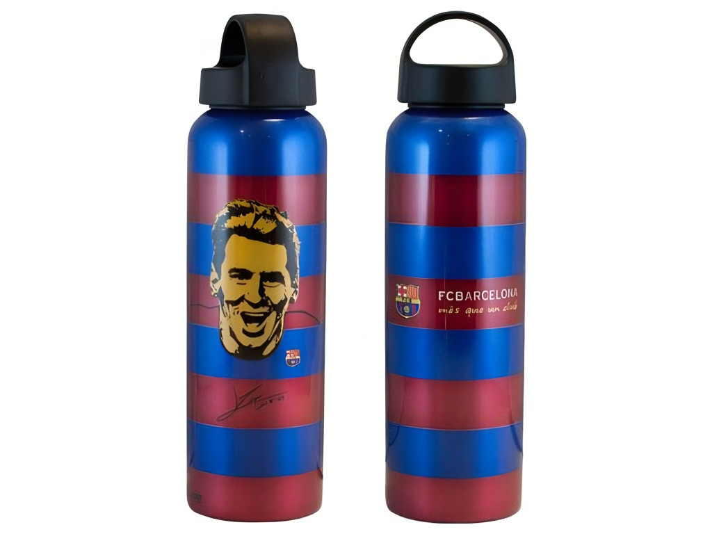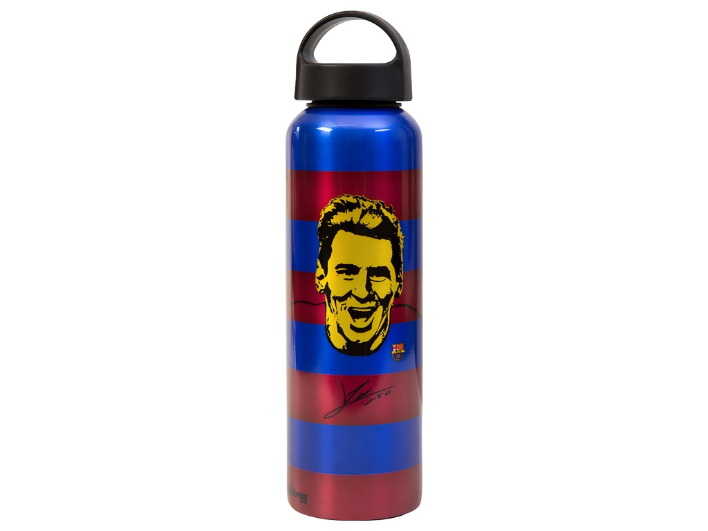 Hliníková sportovní láhev FC Barcelona s portrétem Messi má objem 600 ml. Tělo zdobí modro‑červené pruhy a malý klubový znak na přední straně. Zadní strana nese znak a motto klubu. Černé šroubovací víčko s velkým očkem usnadní přenášení. Lehká konstrukce se příjemně drží a hodí se na každý den.