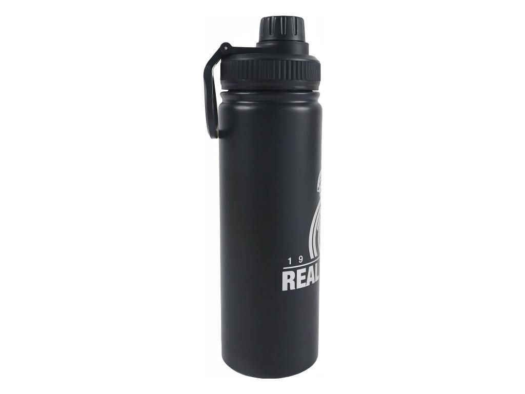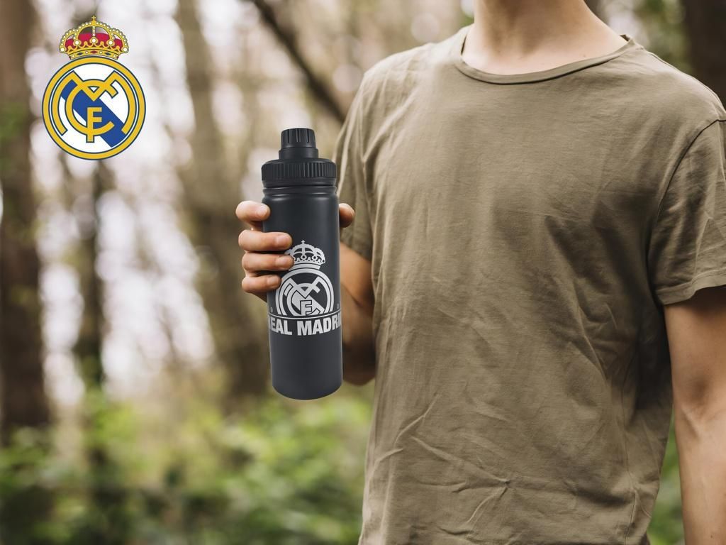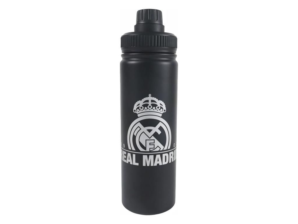Sportovní láhev Real Madrid z nerezové oceli s dvojitou stěnou a praktickým pítkem. Objem 750 ml pojme dostatek nápoje na celý trénink nebo výlet. Dvojitá stěna udržuje teplotu nápoje a zachovává jeho chuť. Matně černé tělo zdobí velký bílý znak klubu s nápisem Real Madrid. Šroubovací uzávěr s výklopným pítkem umožní napít se jednou rukou a integrované poutko usnadní přenášení.