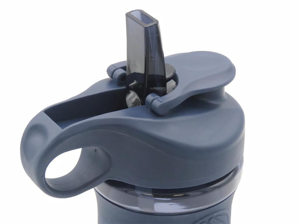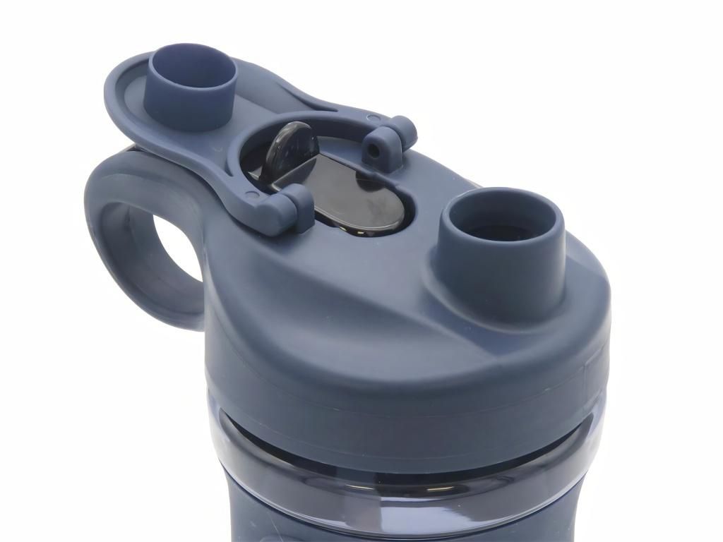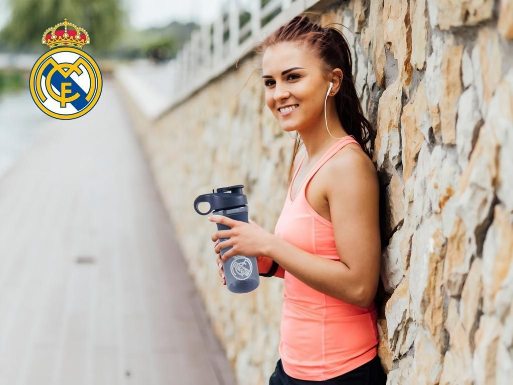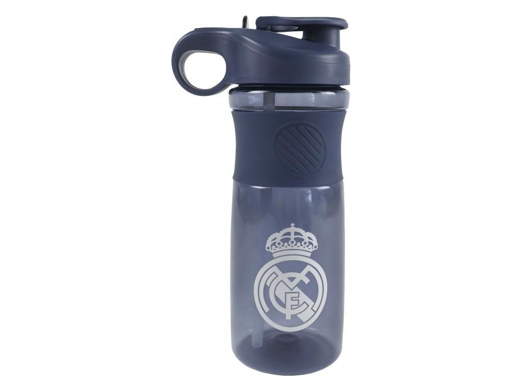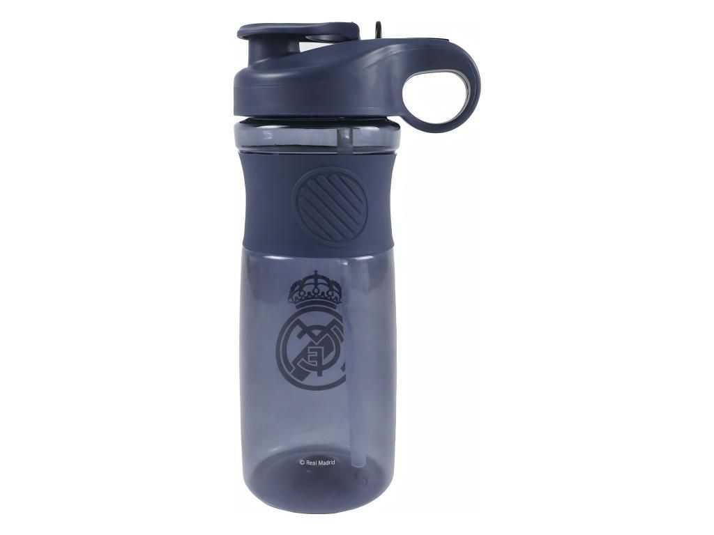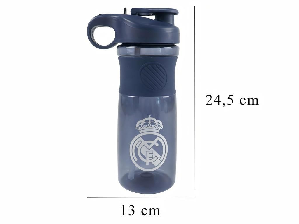 Sportovní láhev Real Madrid s dvojitým pítkem a objemem 800 ml. Tmavě modrá láhev z průsvitného plastu se silikonovým gripem pro pevný úchop. Uzávěr nabízí dvě možnosti pití — sportovní pítko pro rychlé doušky a brčko s náustkem pro pohodlné popíjení. Šroubovací uzávěr se široce otevírá, takže do láhve snadno přidáš kostky ledu. Ergonomické ouško usnadní přenášení na tréninku i na cestách. Na těle láhve je potištěný znak Real Madrid.