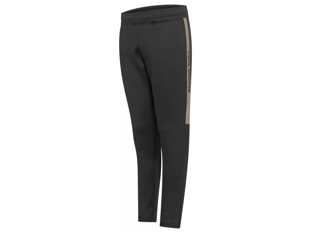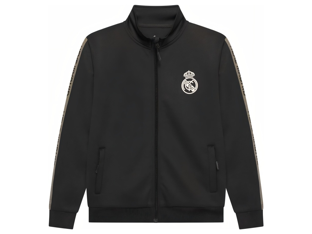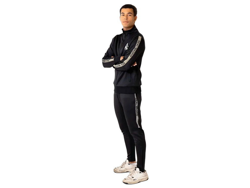 Tepláková souprava Real Madrid v černé barvě pro fanoušky, kteří chtějí sladěný set na každý den. Mikina má stojáček, celopropínací zip a dvě přední kapsy na zip. Na rukávech a nohavicích vede béžová páska s nápisem REAL MADRID. Klubový znak je bílý potisk na hrudi i na stehně. Materiál tvoří lehký 100 % polyester, snadný na údržbu. Žebrované manžety a spodní lem drží tvar při nošení.