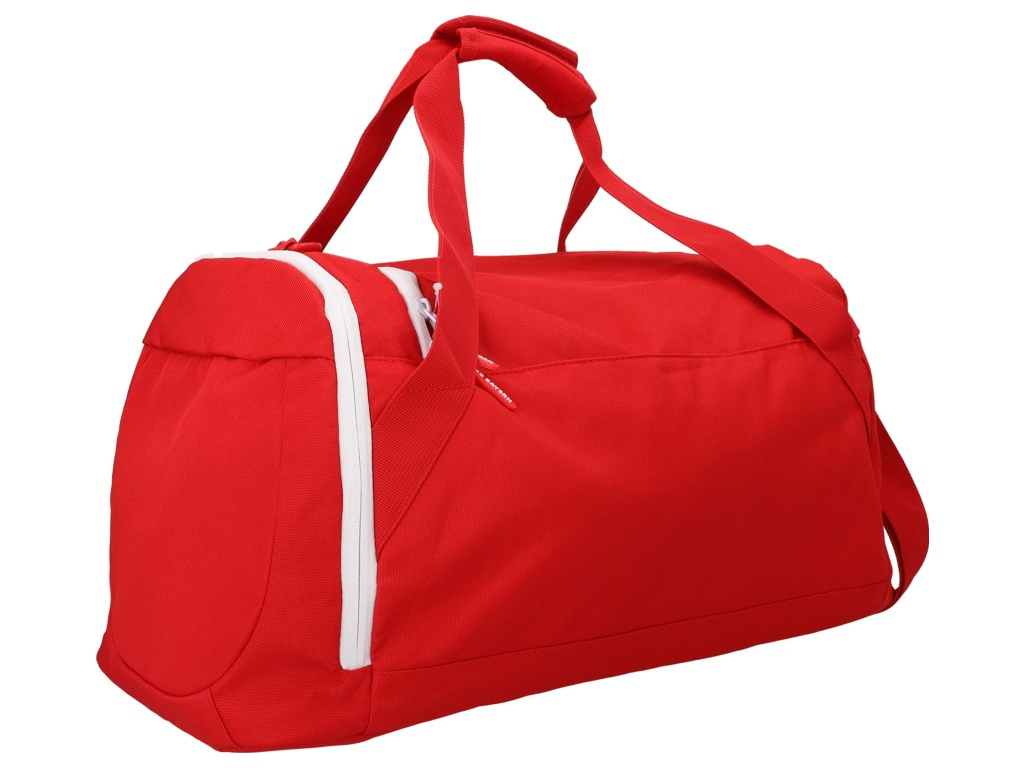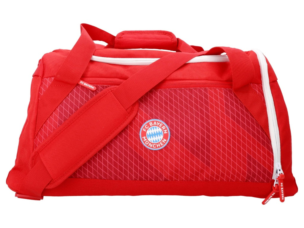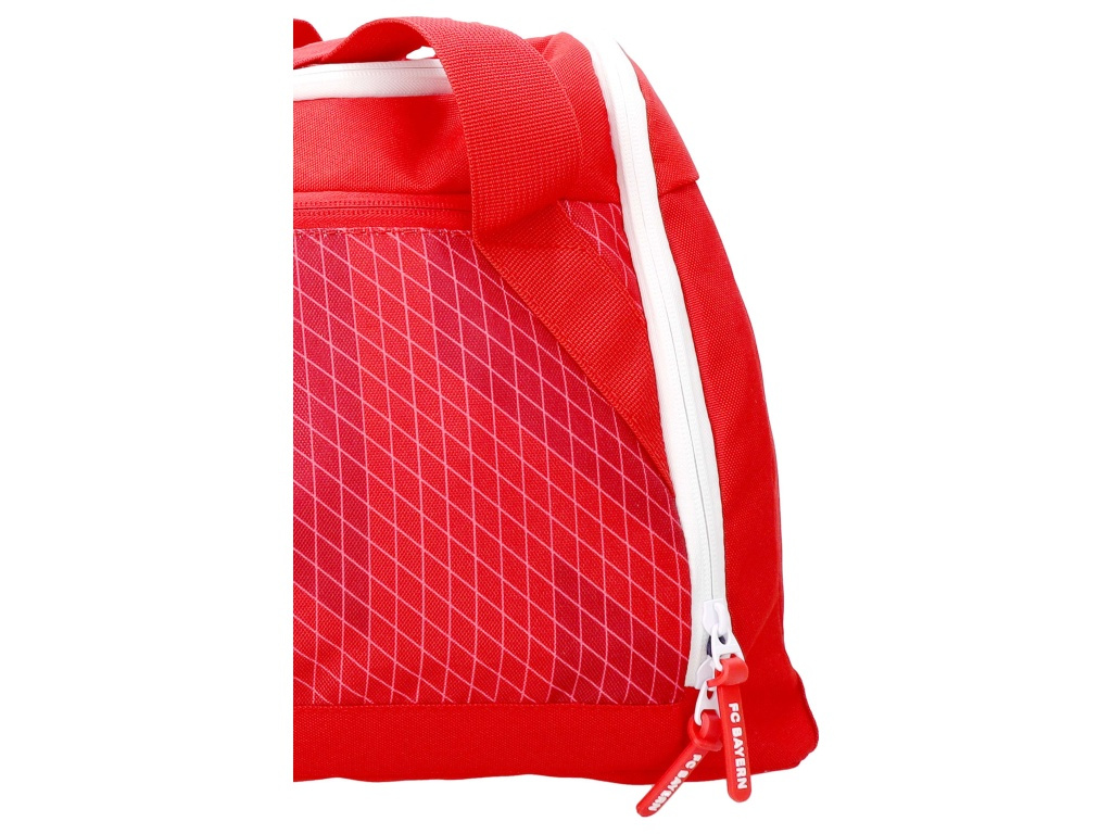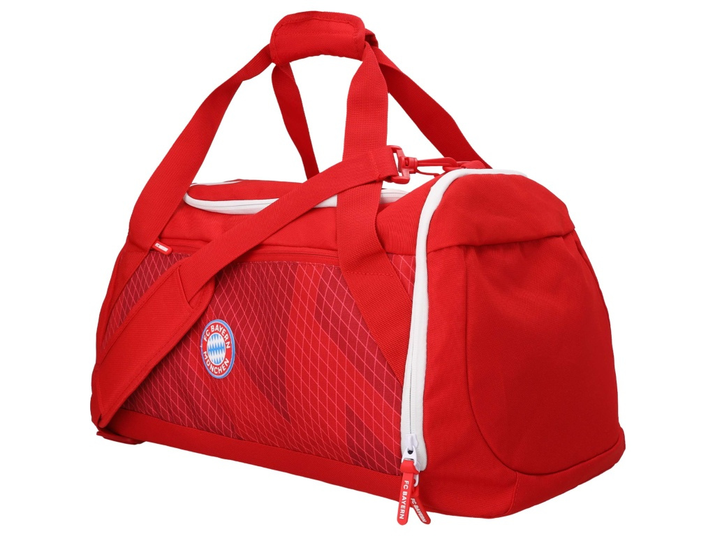 Sportovní taška FC Bayern Mnichov v červené barvě se znakem klubu. Přední stranu zdobí znak FC Bayern Mnichov v gumovém provedení. Hlavní komora na zip. Boční kapsa na zip. Zipy udrží věci bezpečně na místě. Rozměr 52×25×28 cm. Objem 35 l. Horní madla usnadní nošení v ruce. Nastavitelný ramenní popruh zajistí pohodlné přenášení. Vodoodpudivá úprava pomáhá chránit obsah před lehkým deštěm. Taška je z odolného polyesteru. Materiál se snadno čistí. Doporučeno otírat vlhkým hadříkem. Hodí se na tréninky, do posilovny i na víkendové cestování.