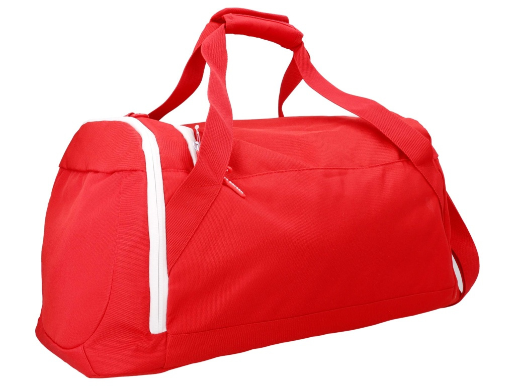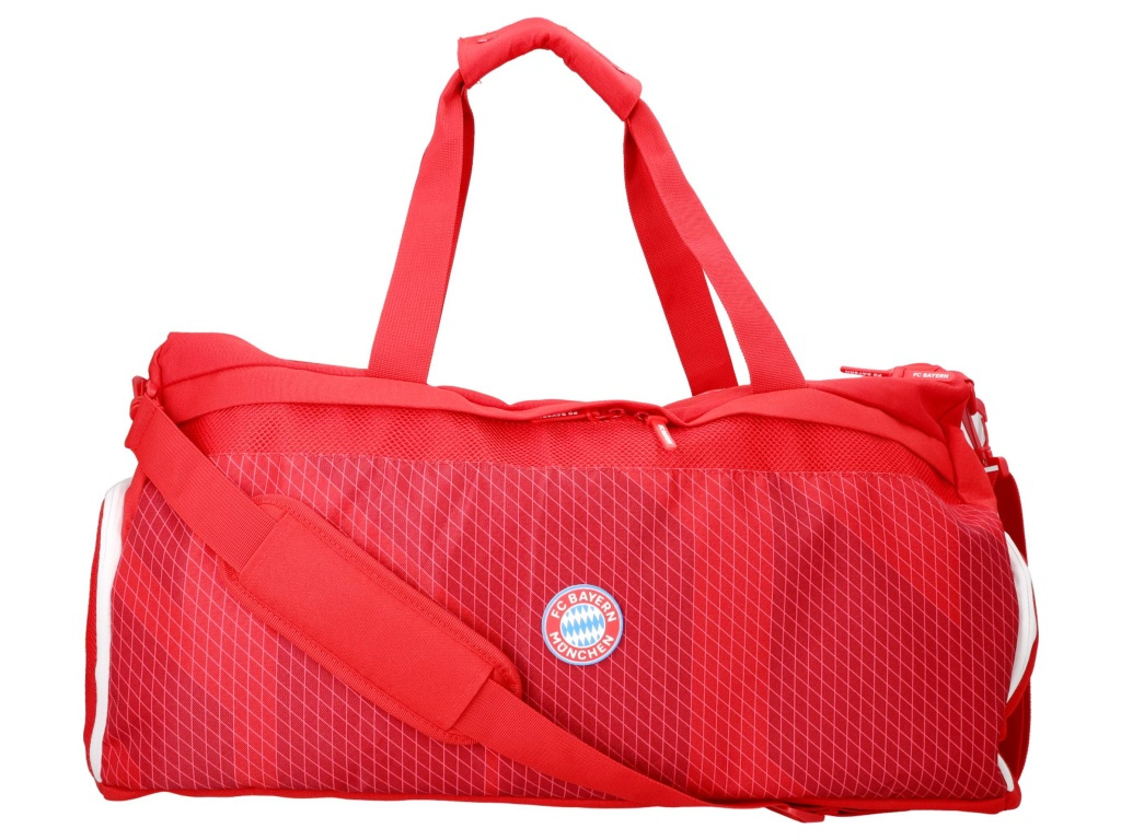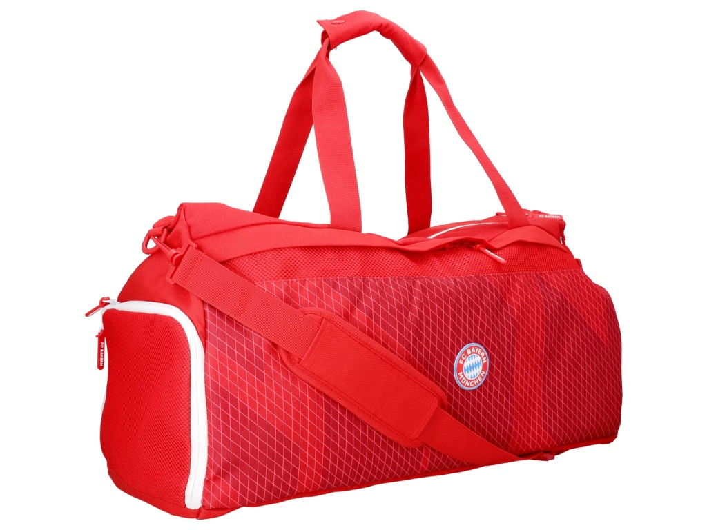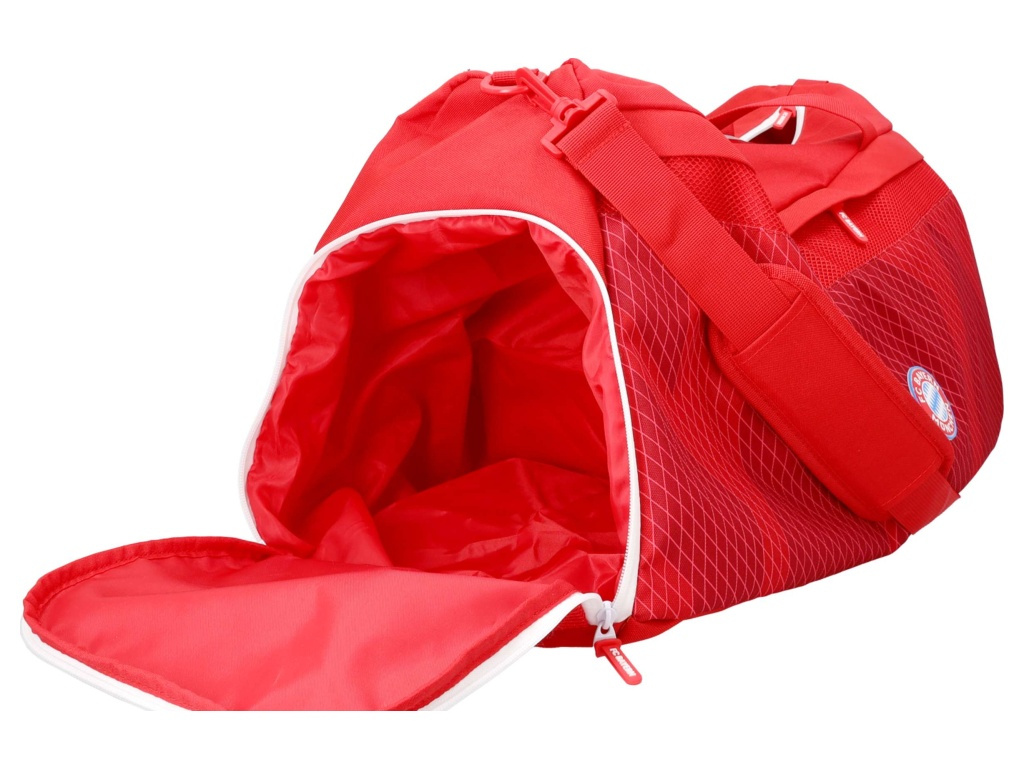 Sportovní taška FC Bayern Mnichov v červené barvě se znakem klubu. Hlavní barva je červená. Tašku zdobí barevný znak FC Bayern Mnichov v gumovém provedení. Výbavu tašky tvoří hlavní a boční kapsa. Kapsy se uzavírají zipem. Rozměr 60×27×35 cm. Objem cca 50 l. Taška má vodoodpudivou úpravu, která chrání obsah před mrholením a kapkami. Taška je vyrobená ze 100% polyesteru. Materiál se snadno udržuje. Doporučeno otírat vlhkým hadříkem. Vhodná na tréninky, školu i krátké cesty.