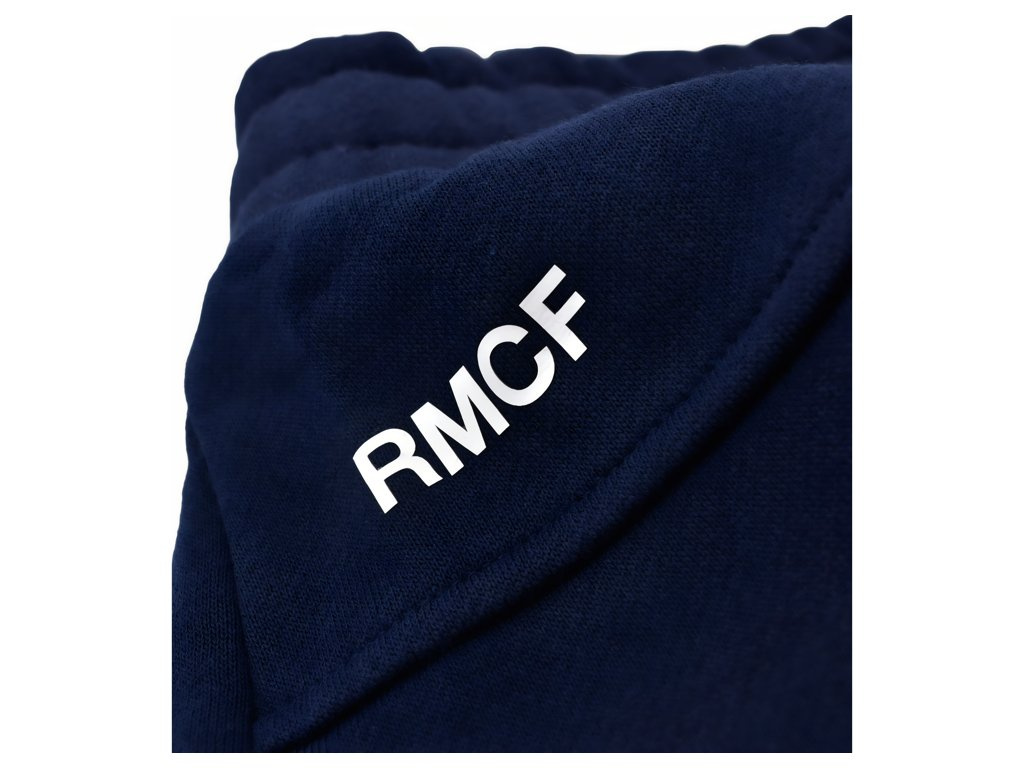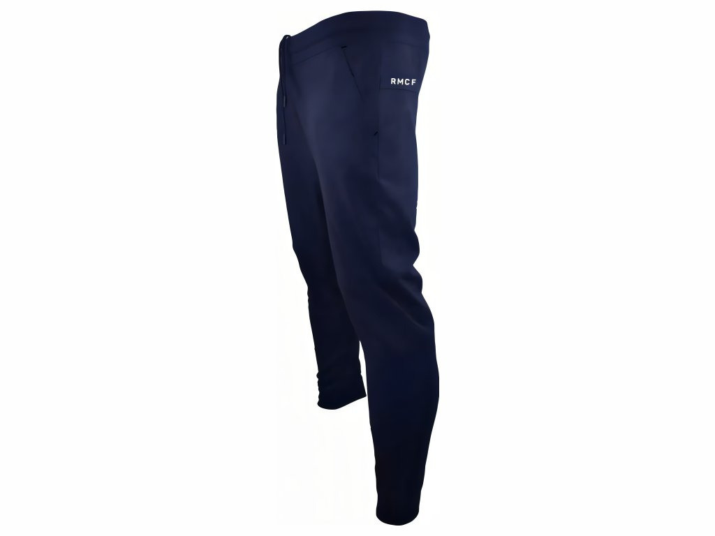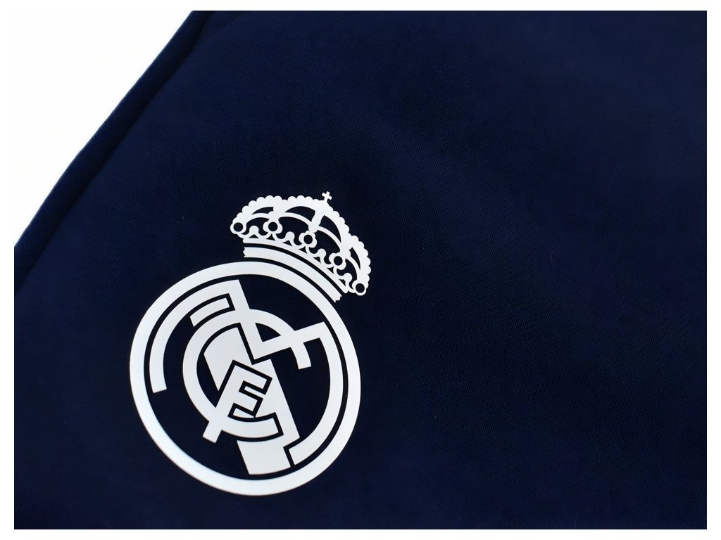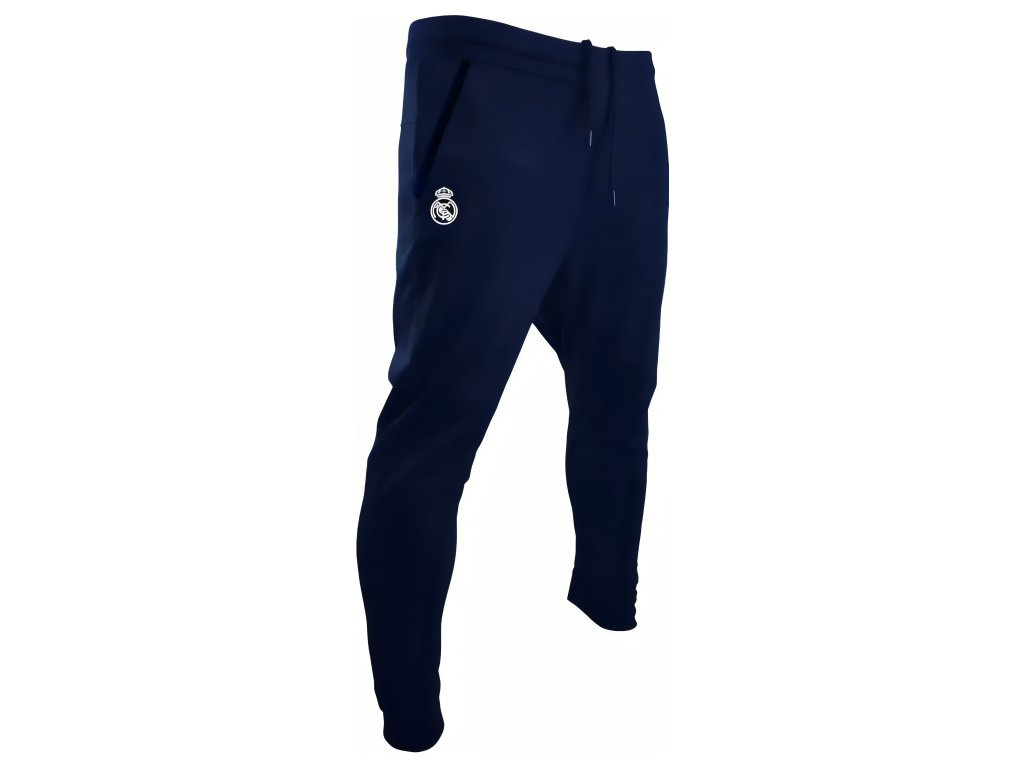 Sportovní tepláky Real Madrid FC v tmavě modré barvě. Znak klubu Real Madrid v bílé barvě na levé straně. Střih s elastickým pasem a šňůrkou umožňuje pohodlné přizpůsobení. Dvě boční kapsy zajišťují praktičnost pro každodenní nošení. Materiál tvoří poly-bavlna (60 % bavlna, 40 % polyester) – příjemný na dotek, prodyšný a odolný. Spodní část nohavic má elastické manžety pro moderní sportovní vzhled a komfort.