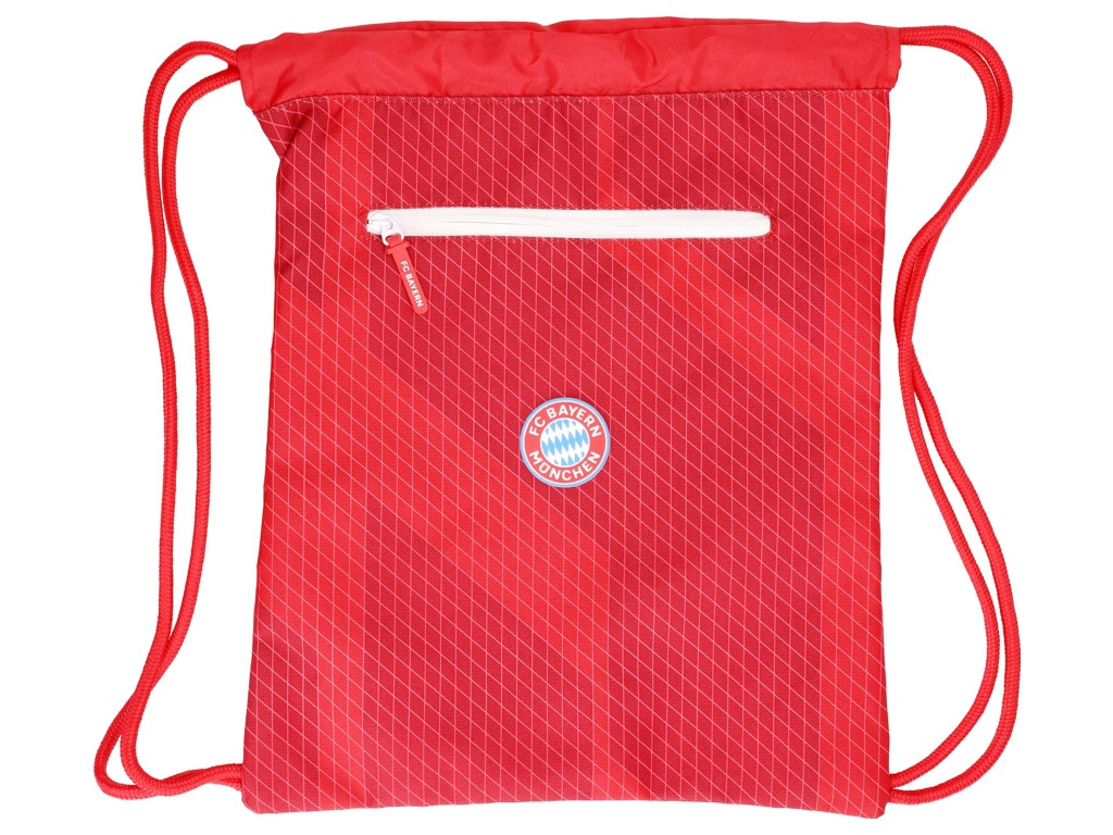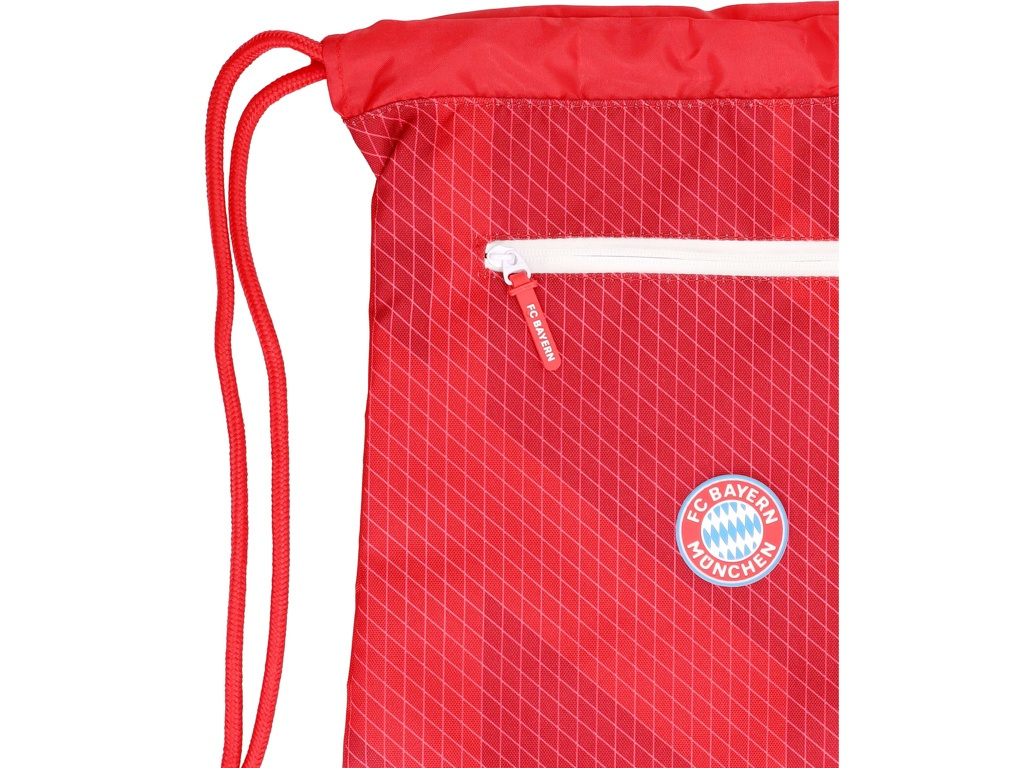 Sportovní vak FC Bayern Mnichov v červené barvě s gumovým odznakem se znakem klubu. Jednoduchý čistý design zvýrazňuje červenou barvu. Přední stranu zdobí znak FC Bayern Mnichov na gumovém odznaku. Výbavu tvoří hlavní komora se stahováním šňůrkami. Na drobnosti slouží zipová kapsa. Šňůrky slouží i jako ramenní popruhy pro nošení na zádech. Vak je lehký a snadno ho složíš do tašky. Rozměr 42 × 36 × 1 cm. Vodoodpudivá úprava chrání obsah před lehkým deštěm. Materiál tvoří 100% polyester. Doporučeno otírat vlhkým hadříkem. Hodí se na tělocvik, trénink i volný čas.