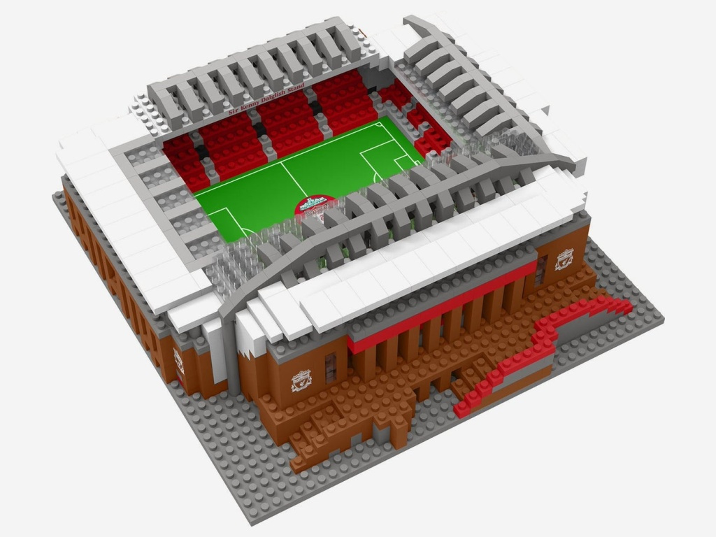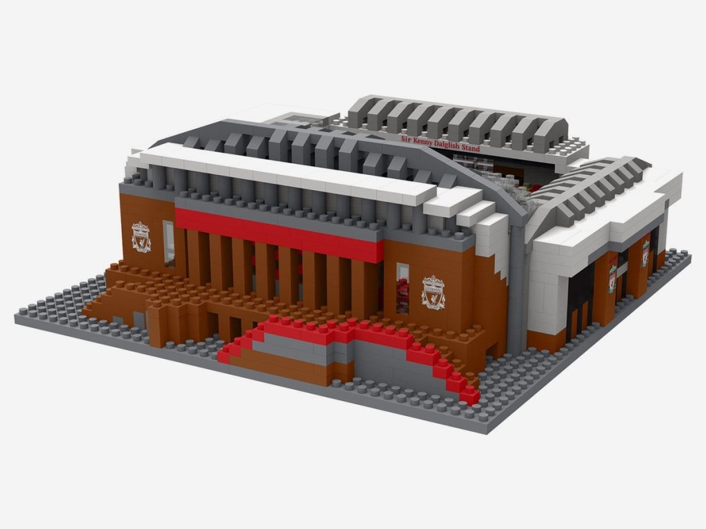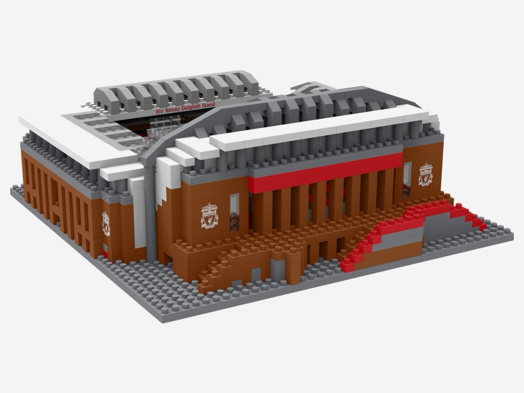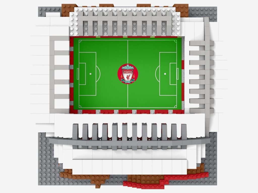 Stavebnice BRXLZ Anfield pro fanoušky Liverpool FC a sběratele 12+. Z 1378 dílků postavíte detailní mini stadion s charakteristickými tribunami. Rozměry po sestavení jsou kompaktní 18 × 13 × 7 cm, vhodné do vitríny nebo na poličku. Součástí jsou samolepky pro stadionní detaily a klubovní znak uprostřed hřiště. Mikro kostky z pevného plastu dobře drží a hotový model působí stabilně.