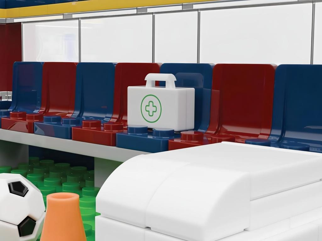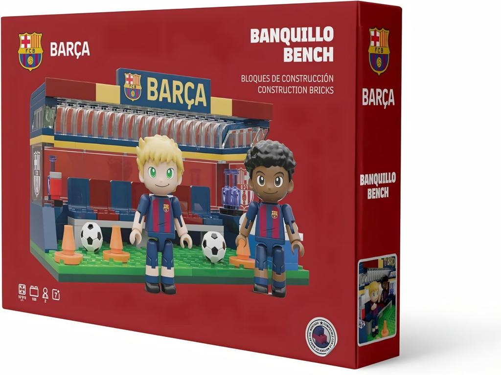 Stavebnice FC Barcelona — lavička střídaček ze 186 dílků. Postav si vlastní scénu z okraje hřiště, kde na střídačce sedí náhradníci a trenéři. V balení najdeš dvě minifigurky hráčů Barçy (cca 4 cm) v klasických modro-červených dresech, míč, tréninkové kužely, barely s vodou i chladicí box. Dílky jsou vyrobeny z odolného ABS plastu a jsou kompatibilní s vybranými stavebnicovými systémy. Sestavená lavička s nápisy BARÇA a znakem klubu vypadá skvěle jako dekorace na poličku i jako hračka na každodenní hraní.