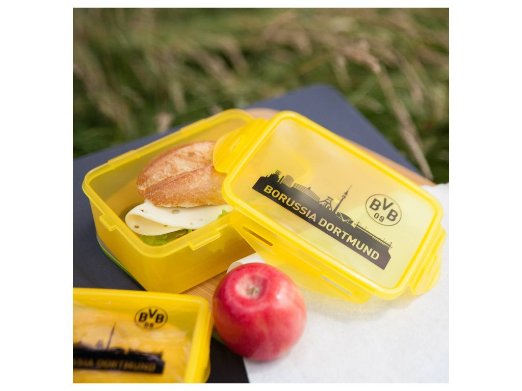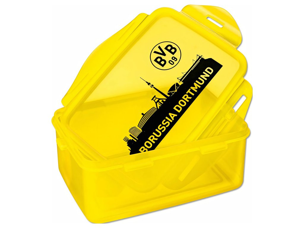 Svačinový box Borussia Dortmund, sada 2 ks, žlutý s klipovým uzávěrem. Žlutý design doplňují černé detaily. Na víku je výrazný znak BVB 09. Souprava obsahuje dva boxy v různých velikostech pro svačinu i menší snack. Otevírání zajišťuje spolehlivý klipový uzávěr. Větší box má rozměry 17 × 12 × 6 cm, menší 15 × 11 × 5 cm. Materiál je zdravotně nezávadný plast, který se snadno se udržuje. Boxy jsou vhodné do myčky, takže údržba je rychlá. Hodí se do školy, na trénink i na výlety.