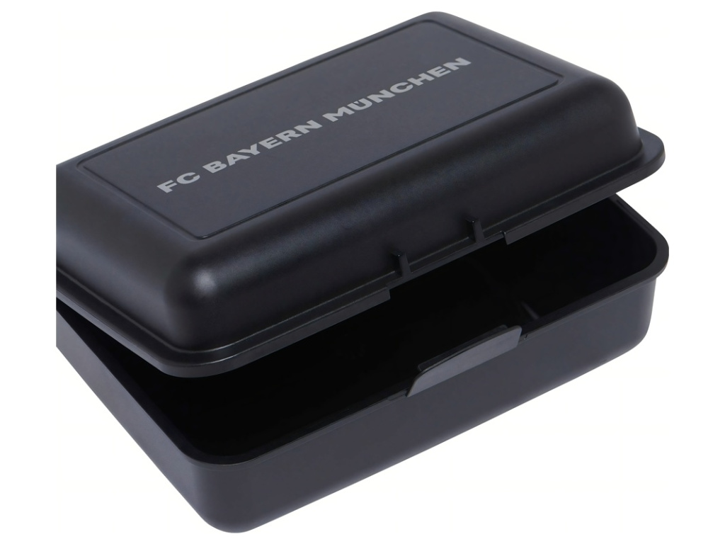 Svačinový box FC Bayern Mnichov v elegantní černé barvě. Box zdobí nápis FC Bayern Mnichov. Praktické zavírání na zacvanutí zdůrazňuje moderní design. Box je vhodný pro školní potřeby, ale také pro svačiny na trénink či cesty. Rozměr 17 x 13 x 7 cm. Materiál je bezpečný pro kontakt s potravinami. Box lze mýt v myčce na nádobí. Není vhodný do mikrovlnné trouby.