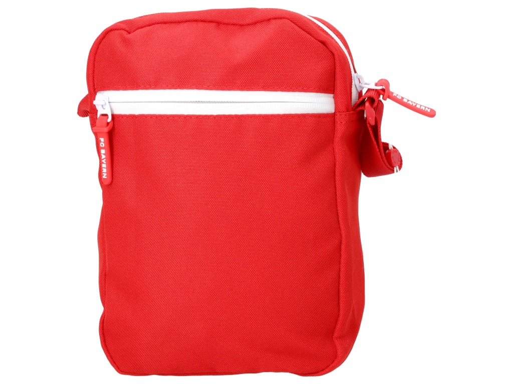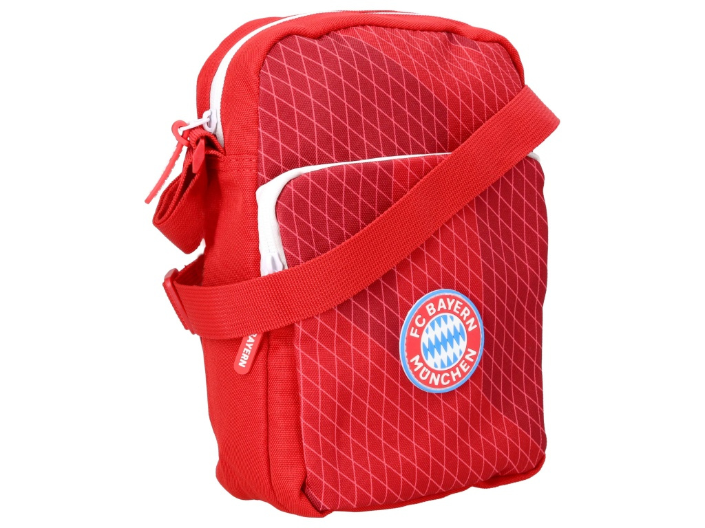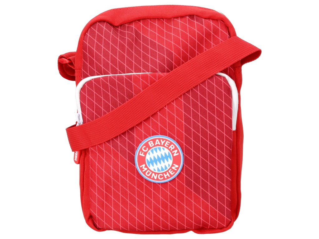 Taška přes rameno FC Bayern Mnichov v červené barvě se znakem na přední straně. Čistý červený design působí sportovně. Přední stranu zdobí znak FC Bayern Mnichov v podobě gumového odznaku. Vybavení tvoří: Hlavní kapsa na zip. Přední kapsa na zip. Zipy drží obsah bezpečně. Rozměr 23 × 18 × 6 cm. Objem cca 2,5 l. Ramenní popruh je nastavitelný. Taška se nosí pohodlně přes rameno. Voděodpudivá úprava ochrání věci před slabým deštěm. Taška je z odolného polyesteru. Doporučeno otírat vlhkým hadříkem. Hodí se na drobnosti do města, na stadion i na cestování.