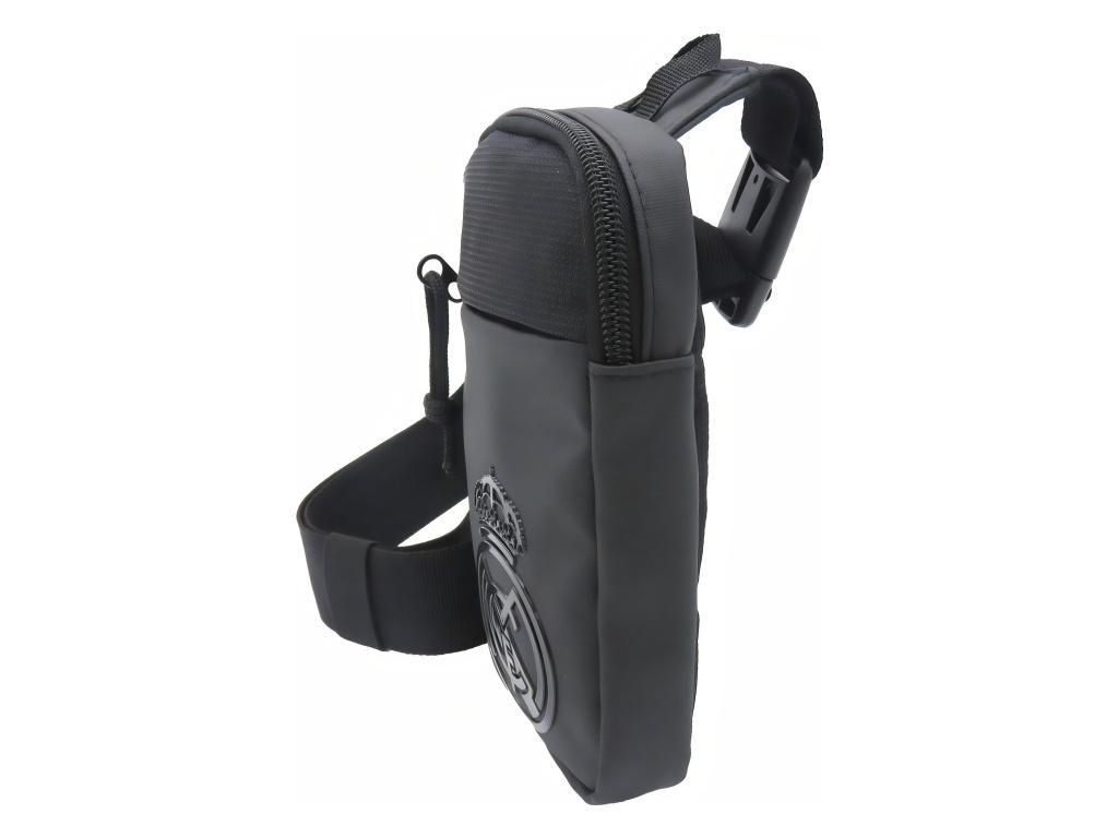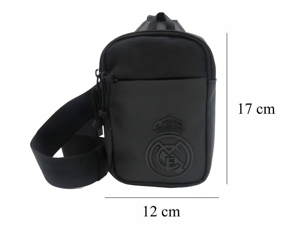 Taška přes rameno Real Madrid v kompletně černém provedení s pogumovaným znakem klubu. Kompaktní rozměry 12 × 17 cm pojmou telefon, klíče, peněženku a další drobnosti. Dvě kapsy na zip umožňují přehledné roztřídění věcí. Nastavitelný popruh s plastovou přezkou si snadno přizpůsobíš na požadovanou délku. Malé ouško nahoře poslouží k zavěšení nebo rychlému přenesení v ruce.