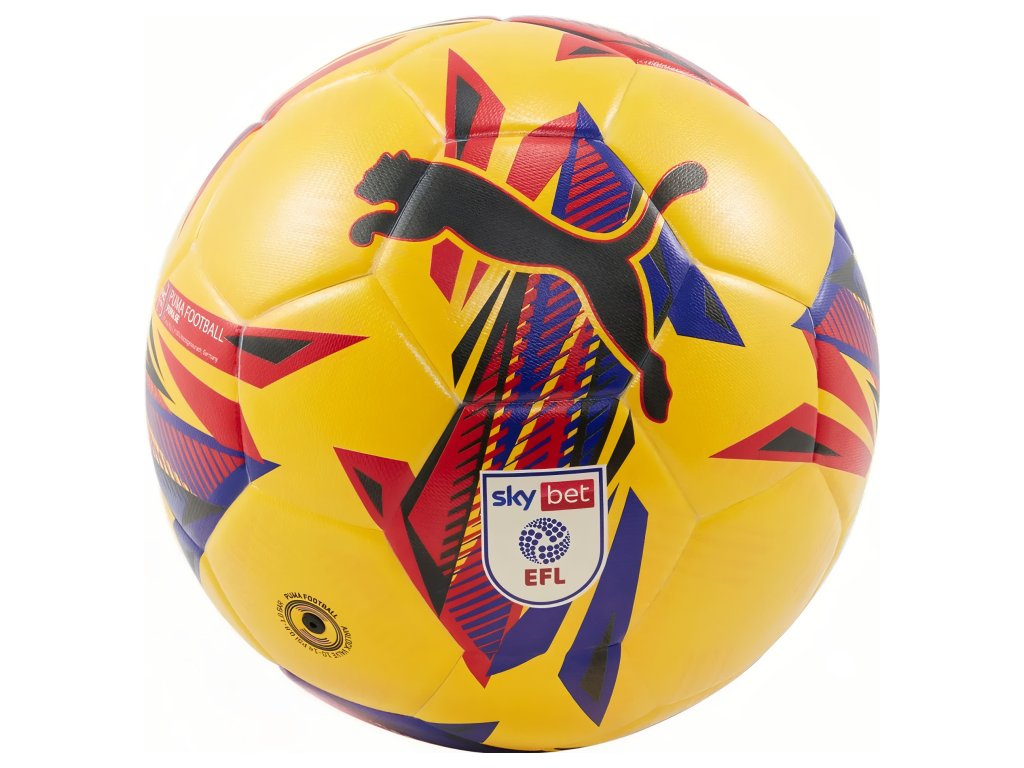 Tréninkový míč Puma Orbita 6 24/25 ve velikosti 5 v žlutém provedení pro pravidelné hraní – měkký dotek, stabilní let a tvarová stálost. Výrazná žlutá s červenými, modrými a černými prvky zlepšuje viditelnost v rychlé hře. Dominantu tvoří černý motiv Puma a přední stranu doplňuje znak Sky Bet EFL. Velikost 5 je vhodná pro hráče přibližně od 13 let. 32 panelů se stejnou plochou pomáhá držet tvar, TPU povrch s pěnovou vrstvou zpříjemňuje ovládání. Pro bezpečnou dopravu míč posíláme vyfouknutý; před první hrou jej dofoukněte doporučeným tlakem.
