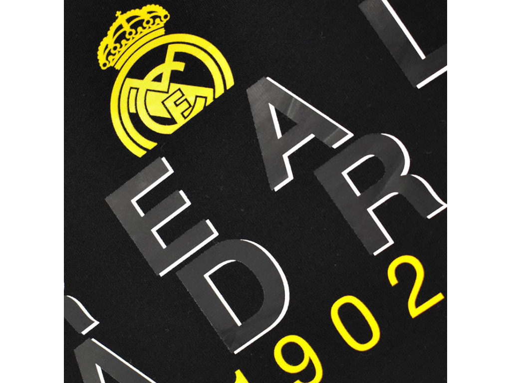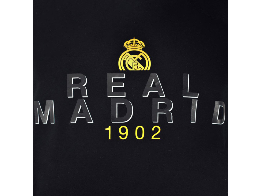 Černé tričko Real Madrid 1902 z měkké 100 % bavlny pro fanoušky každodenního stylu. Krátký rukáv a kulatý výstřih. Na hrudi je kontrastní potisk se žlutým klubovým znakem, nápisem REAL MADRID a rokem 1902. Materiál je příjemný na tělo a prodyšný. Hodí se na zápas, do školy i do města.