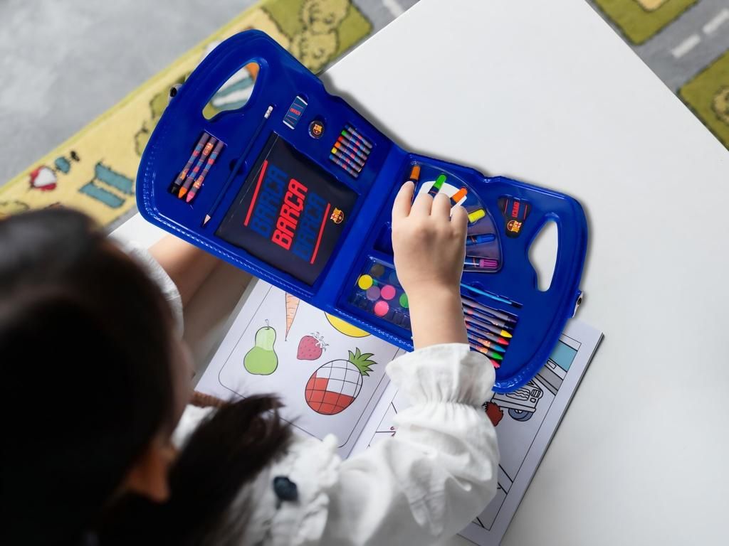 Kufřík se hodí jako dárek k narozeninám nebo odměna za vysvědčení — stačí otevřít a hned se dá tvořit. Díky tvarovaným přihrádkám má každá pastelka i fix své místo a nic se neválí po stole. Až kreslení skončí, všechno se zacvakne zpátky a kufřík jde schovat do poličky. Pro malého fanouška Barcy je to výbava, se kterou bude rád kreslit znova a znova.