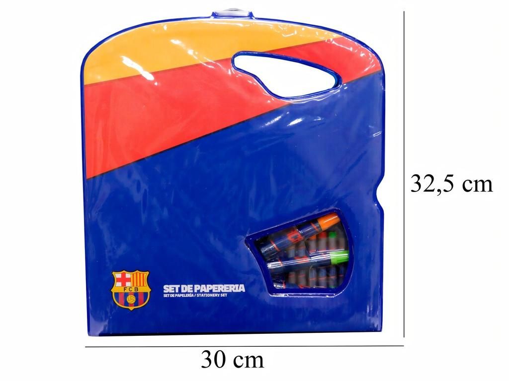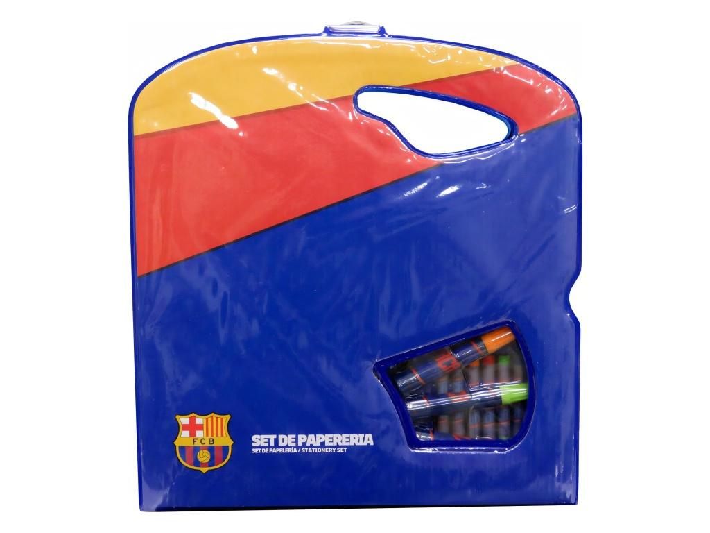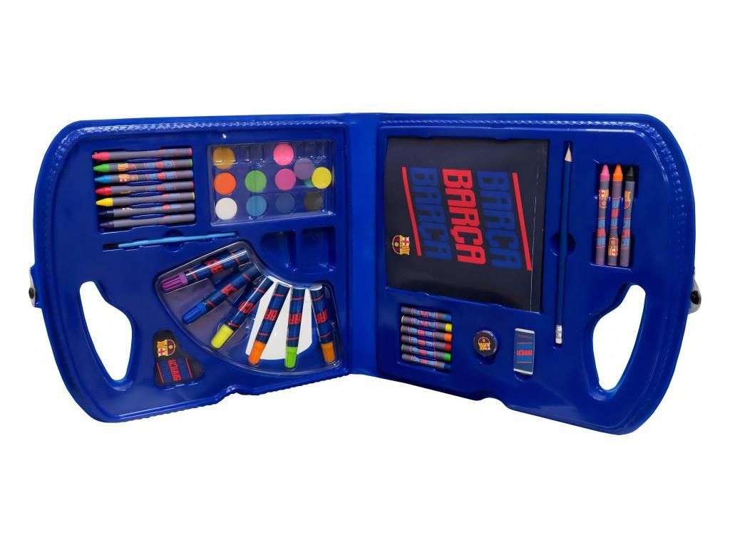 Výtvarný kufřík FC Barcelona se sadou 39 ks pro malé i větší výtvarníky. Modrý plastový kufřík v klubových barvách ukrývá kompletní výbavu na kreslení a malování. Po rozevření najdeš přehledně uspořádané voskovky, pastelky, fixy, vodové barvy se štětcem i kreslicí blok s prázdnými listy. Kufřík má integrované madlo, takže ho snadno vezmeš kamkoli — na kroužek, na prázdniny nebo prostě na odpoledne u stolu. Na přední straně je znak FC Barcelona a diagonální pruhy ve žluté a červené.